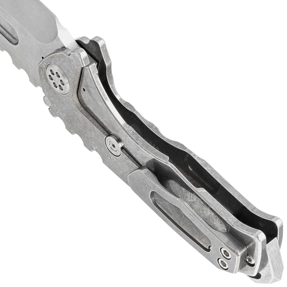 Handle - made from solid titanium, also finished with a machine-applied "tumbled" technique. All Praetorian variants are equipped with a D2 hardened steel backspacer, coated with NP3 which is also a glass breaker. MKT has thoroughly tested these backspacers and found that they are completely reliable and 100% functional. No tricks. There will be no other variants of this backspacer, in a different material or shape, as it is meant to save lives in an emergency, not for decoration. Wear hand and arm protection when testing, as excessive impact force will ALWAYS cause cuts! The whole thing is completed with a solid, clip, also made of titanium, of course.