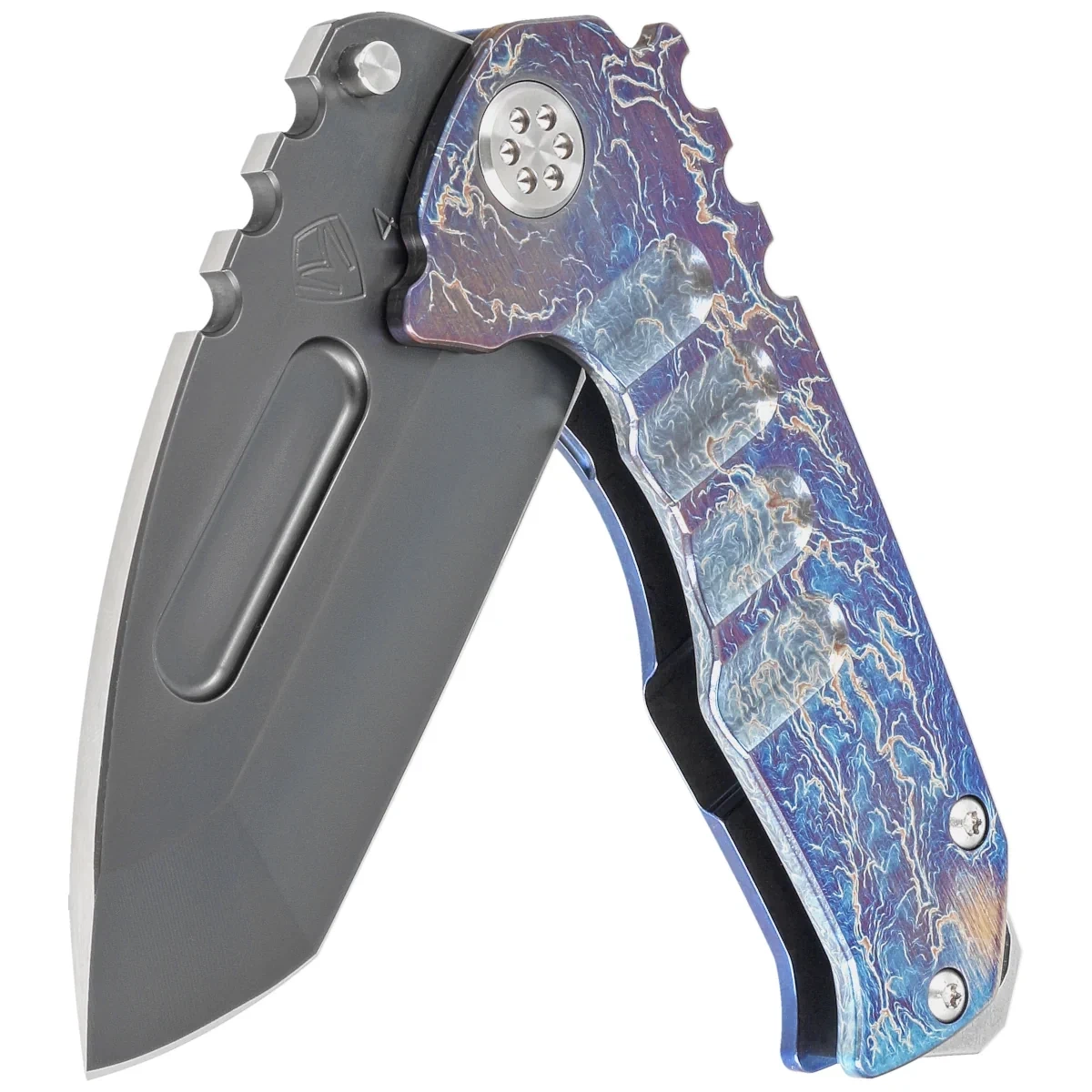 Handle - made of solid titanium dyed thermally with the help of a torch. All Praetorian variants are equipped with a D2 hardened steel backspacer, coated with NP3 which is also a glass breaker. MKT has thoroughly tested these backspacers and found that they are completely reliable and 100% functional. No tricks. There will be no other variants of this backspacer, in a different material or shape, as it is meant to save lives in an emergency, not for decoration. Wear hand and arm protection when testing, as excessive impact force will ALWAYS cause cuts! The whole thing is completed with a solid, clip, also made of titanium, of course.