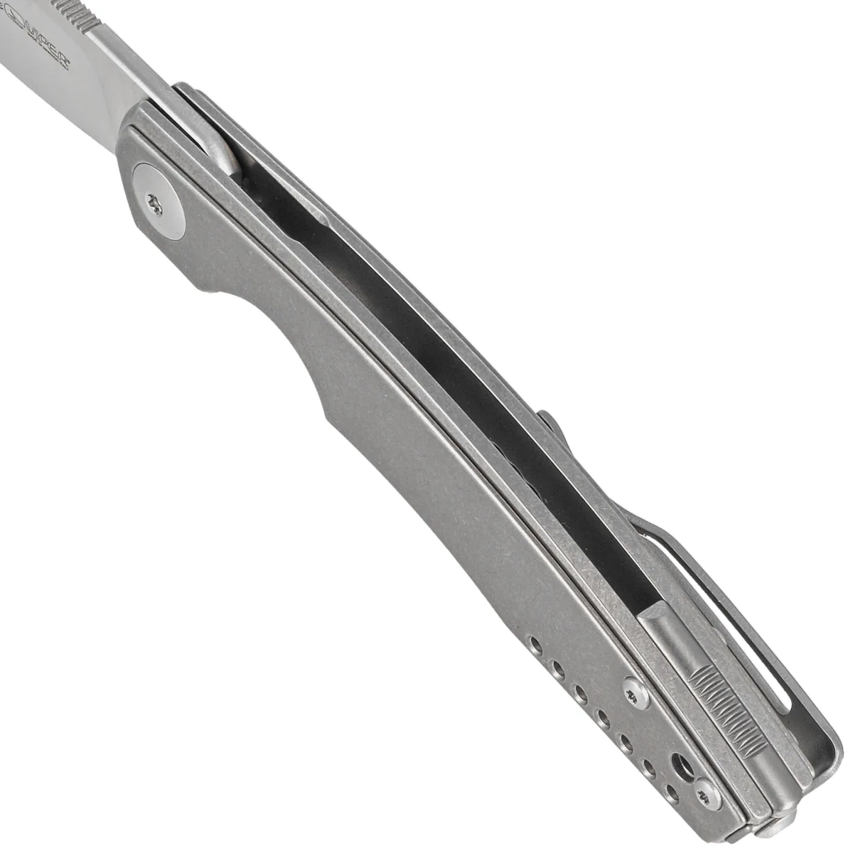 Belone Stonewashed Titanium, Satin, we invite you to discover a unique tool that combines tradition and modernity. We are talking about a model that draws inspiration from classic Italian knives, and at the same time fits into the minimalist style of Danish designer Jesper Voxnaes. Its design is a combination of elegance and functionality. It is made of stonewashed finished titanium, which gives it a unique character. The satin finish adds to its elegance while emphasizing its practicality. This lightweight folder is decorated with sophisticated details that catch the eye and make it stand out. But there's more to it than looks - it's primarily a unique combination of style and functionality. Designed for those who appreciate both aesthetics and practicality. Thanks to its design and the materials from which it is made, it is extremely durable and reliable. The blade is made of superior Böhler M390 Microclean® knife steel, which guarantees excellent sharpness and durability. The Liner Lock mechanism ensures safety during use. This knife is not only a tool, but also an expression of personal style. Ideal for those who appreciate remarkable design and reliability!