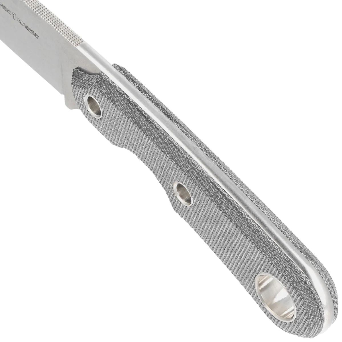 Handle - made of Canvas Micarta composite (pressure-pressed canvas with synthetic resin), riveted directly to the blade, provides a virtually indestructible construction. The rounded shape of the covers eliminates sharp edges. The unique ergonomics of the Handle allows the knife to be held both ways, especially for users who appreciate an inverted grip. On the back of the Handle an enlarged lanyard hole, which is a hole for attaching a belaying line.