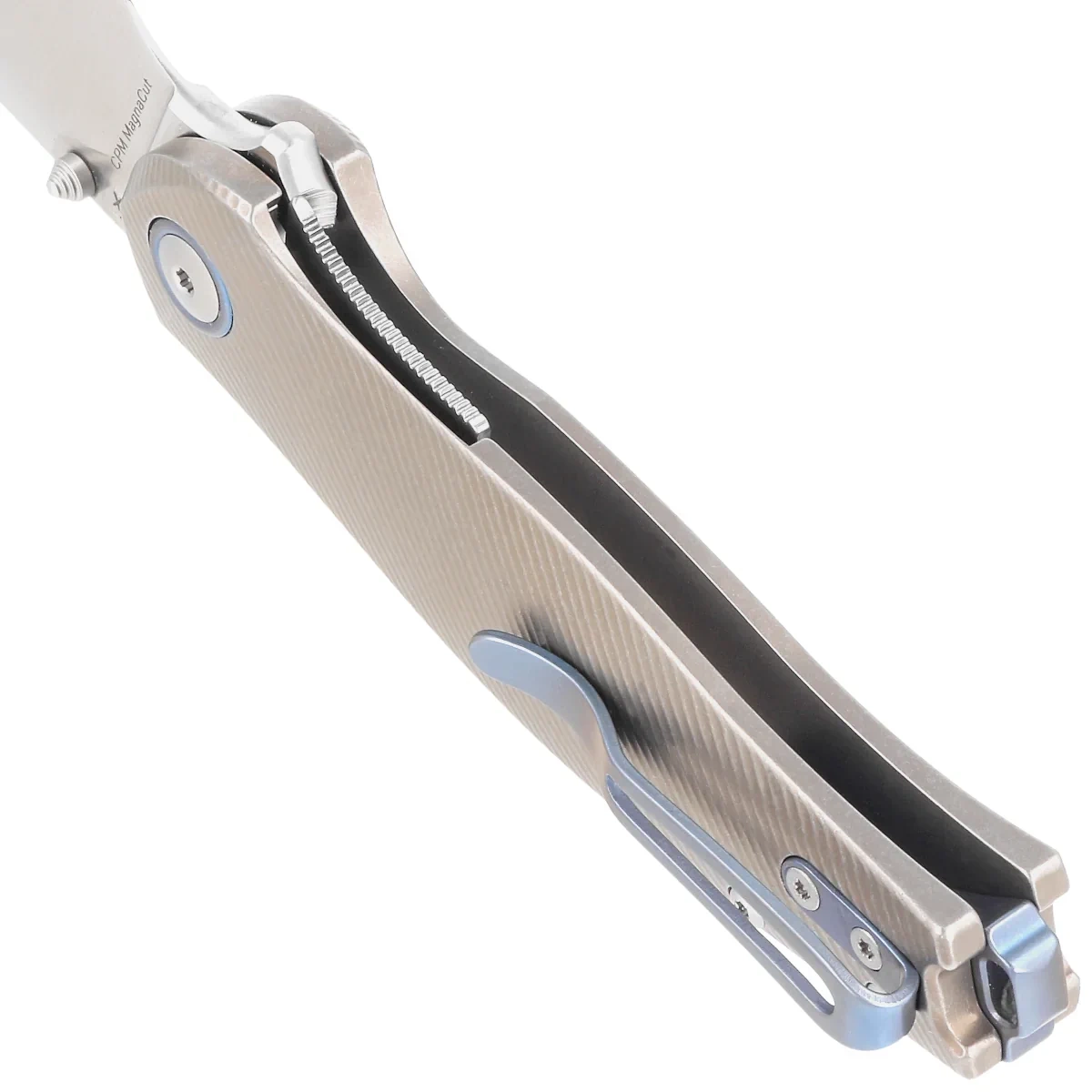 Vale Bronze Anodized Titanium, Satin extraordinary product, combining elegance and functionality. A knife that is the result of a combination of excellent materials and masterful design. It is the work of Jesper Voxnaes, a well-known knife designer, whose works always stand out in terms of ergonomics and style. This particular model is unique in many ways. Handle grips are made of titanium, the blade, made of what is currently considered the best CPM MagnaCut knife steel, providing excellent cutting properties. The blade can be opened in two different ways. A deep clip makes it easy to carry and provides security. All this makes this knife an ideal choice for people who appreciate both style and functionality. It is not only a practical tool, but also an elegant accessory that will enhance the individual style of each user. Whether you are a knife collector or simply appreciate high quality and functionality, this knife is sure to meet your expectations.