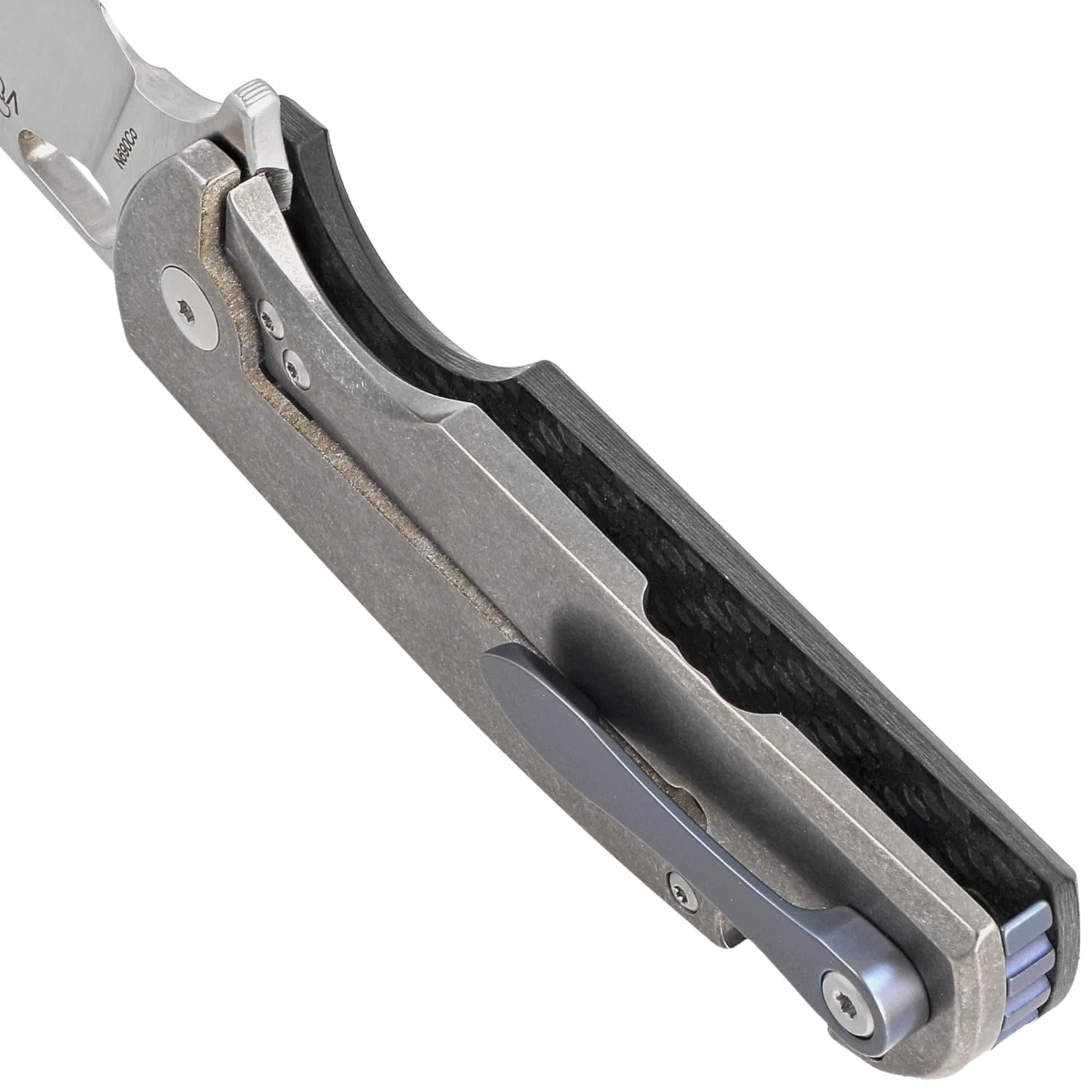Handle - one side is a thick piece of black Carbon Fiber (carbon fiber compressed under pressure with synthetic resin), and the other side is solid titanium. The covers were attached to a CNC-milled titanium backspacer anodized blue, which provides the desired rigidity and strength to the whole structure. CNC-machined double-sided (right/left), two-position deep carry clip allows to carry the knife discreetly in tip-up position (blade tip up). Above the clip a lanyard hole, an oval slot for a cord.