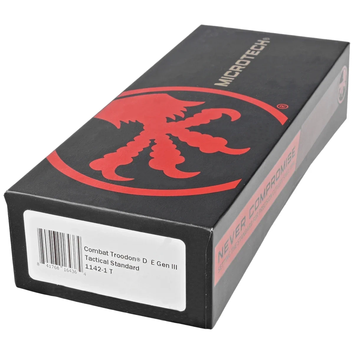 Combat Troodon Gen III D/E Black Aluminum, Tactical featuring a tactical blade finish. This largest of automatic knives represents the pinnacle of precision engineering and tactical prowess in the realm of OTF (Out The Front) knives. Designed for a wide range of utility applications, it boasts a size 25% larger than the flagship Troodon. Precisely crafted, it features a sophisticated and hellishly fast mechanism that extends the razor-sharp blade. It is 100% made and assembled in the USA. The design is by Anthony Marfione, knifemaker and owner of Microtech Knives.