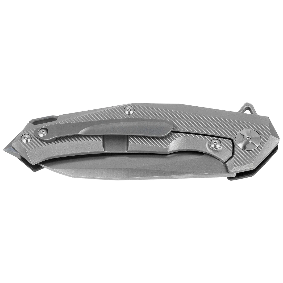 Handle - presentation side made of G10 composite , practically indestructible plastic, insensitive to weather conditions, resistant to chemicals and mechanical damage. Lock side made of titanium. The chamfered edges of the covers eliminate sharp edges for convenience, and the finger undercut made on the front improves ergonomics. The backspacer to which the grips are attached guarantees the rigidity and strength of the entire structure. A single-position (right) deep-carry clip allows you to carry the knife discreetly in your pocket in tip-up position (with the tip of the blade upward). In the protruding part of the backspacer lanyard hole, a hole for a decorative or belaying rope. In the backspacer a glass striker, which can also be used for self-defense.