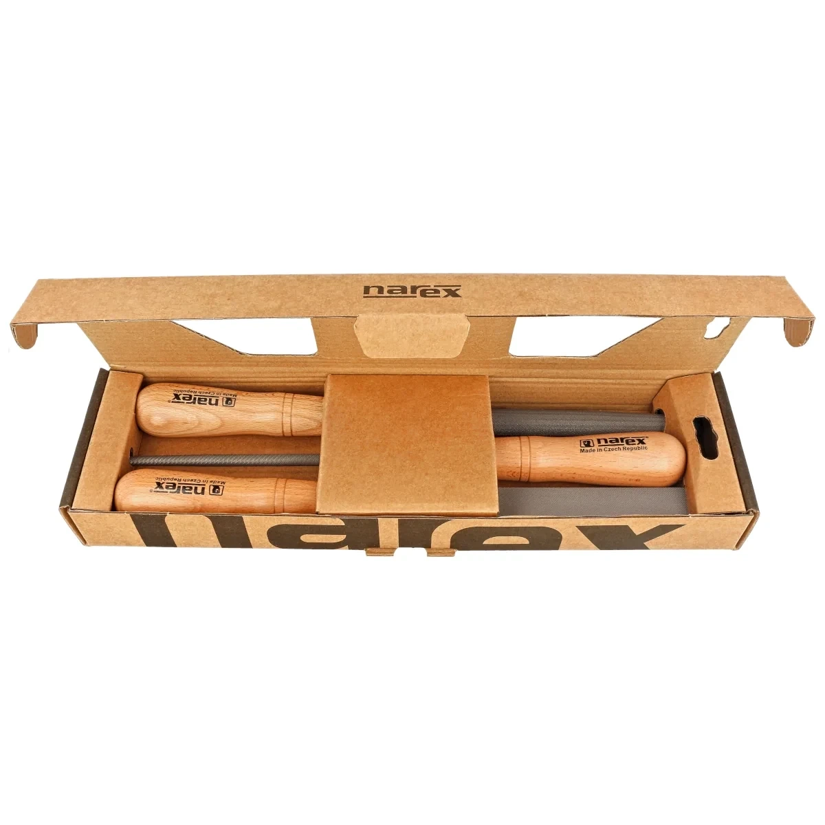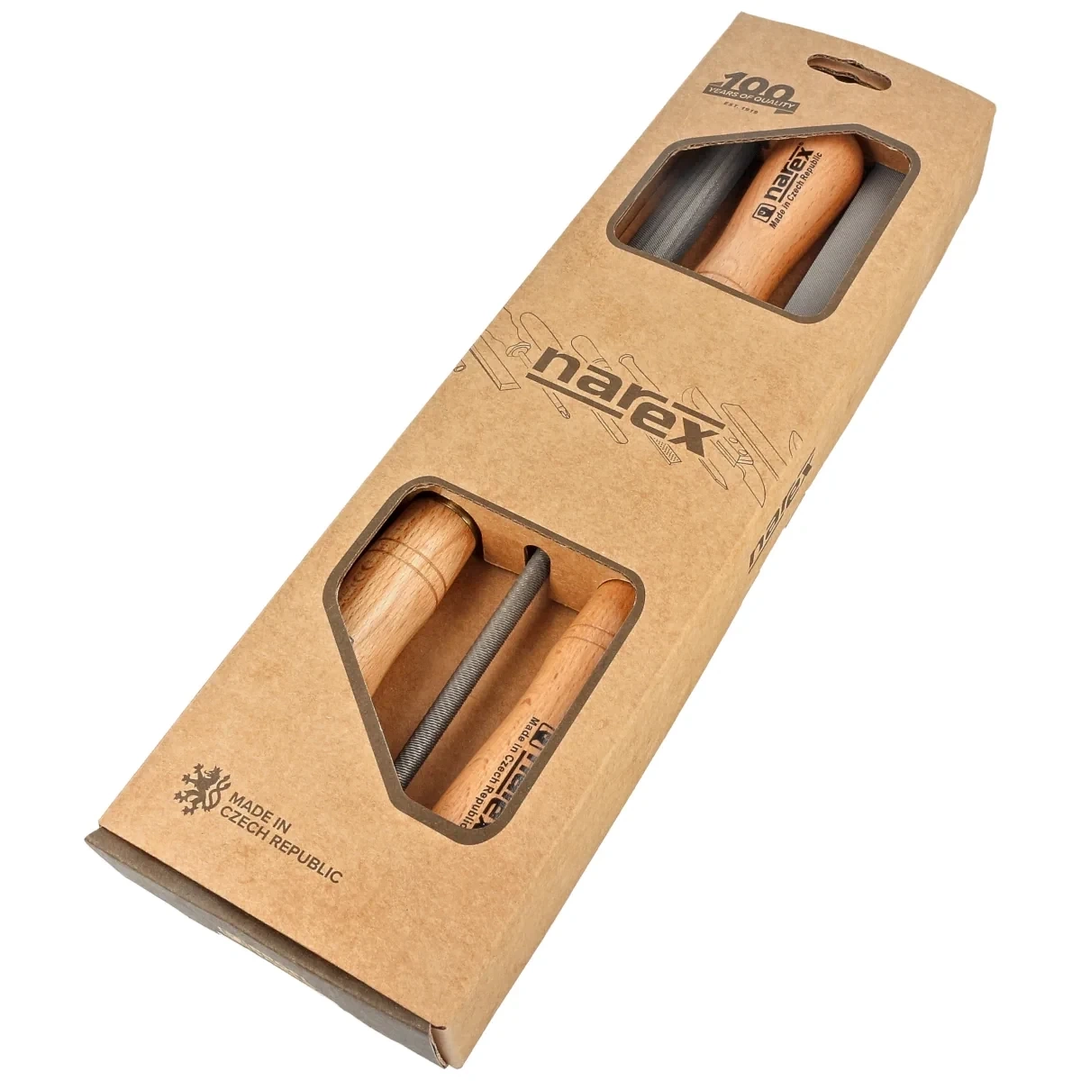 • High-quality 200 mm metal files from the Czech brand Narex. The set includes three file types – flat, half-round, and round. Made from high-carbon tool steel, hardened to a hardness of 62 HRC. Traditional handle crafted from durable beech wood.