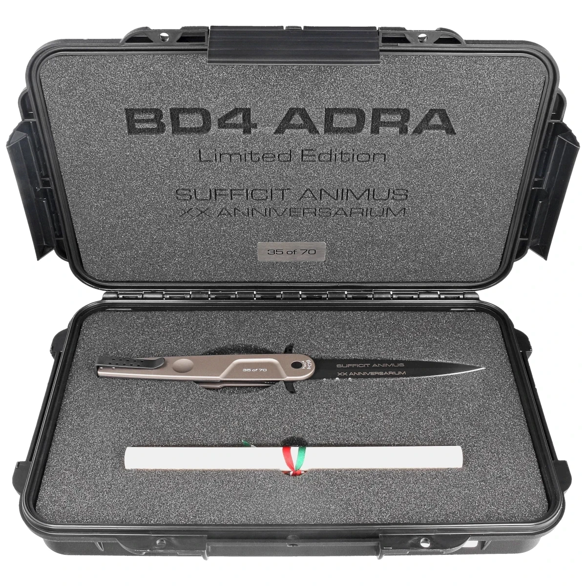 BD4 Adra Contractor LE No 35/70 Tactical Mud Aluminum, Black Limited Edition. Limited to 70 pieces, a limited edition of a large folding tactical knife issued to celebrate the 20th anniversary of the Italian Air Force's special unit, the 17 Stormo Incursori. The knife, numbered 35, its name refers to and pays tribute to the heroic Arditi Distruttori unit of the Regia Aeronautica (ADRA), operating in North Africa during World War II, which won two silver medals for valor on the battlefield.