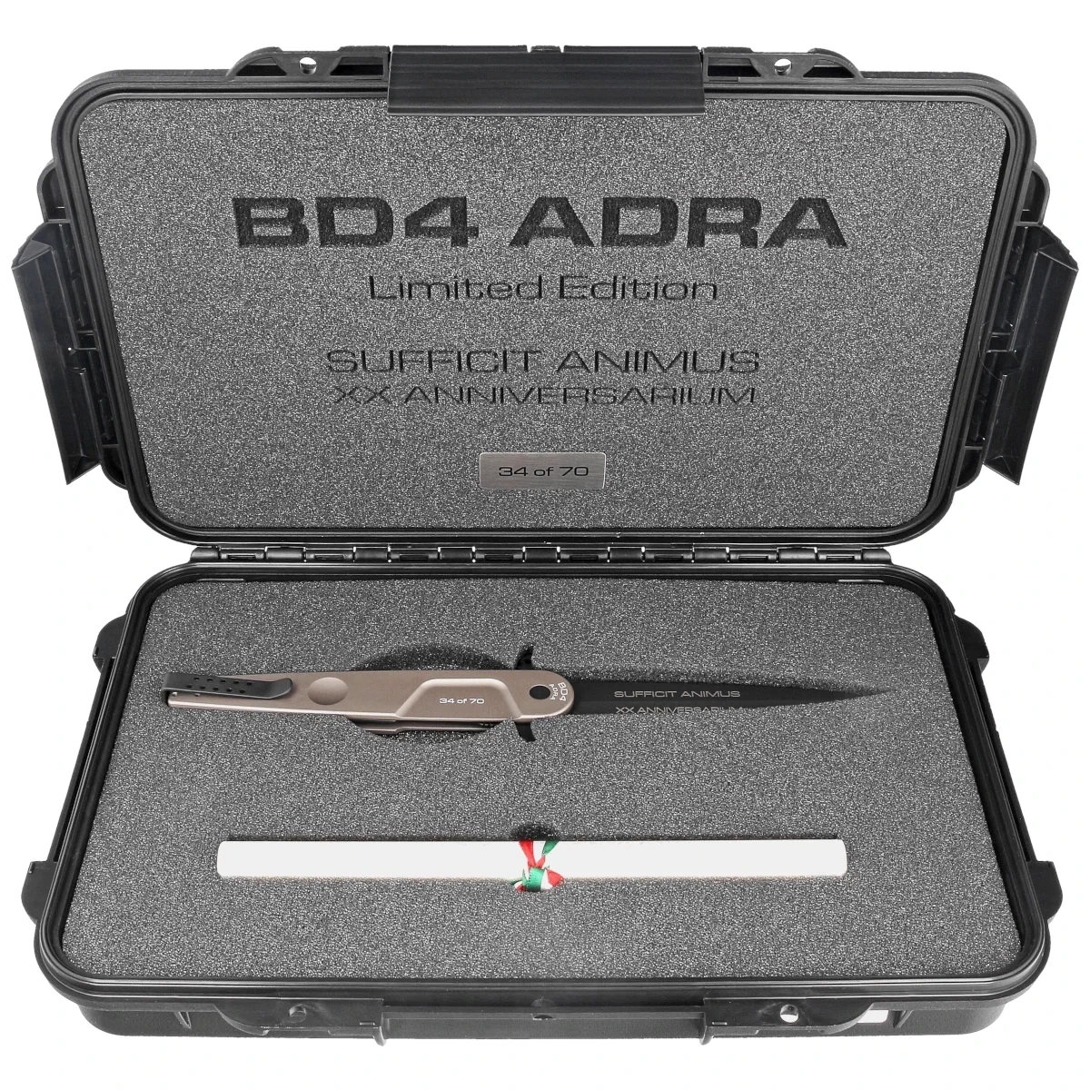 BD4 Adra Contractor LE No 34/70 Tactical Mud Aluminum, Black Limited Edition. Limited to 70 pieces, a limited edition of a large folding tactical knife issued to celebrate the 20th anniversary of the Italian Air Force's special unit, the 17 Stormo Incursori. The knife, numbered 34, its name refers to and pays tribute to the heroic Arditi Distruttori unit of the Regia Aeronautica (ADRA), operating in North Africa during World War II, which won two silver medals for valor on the battlefield.