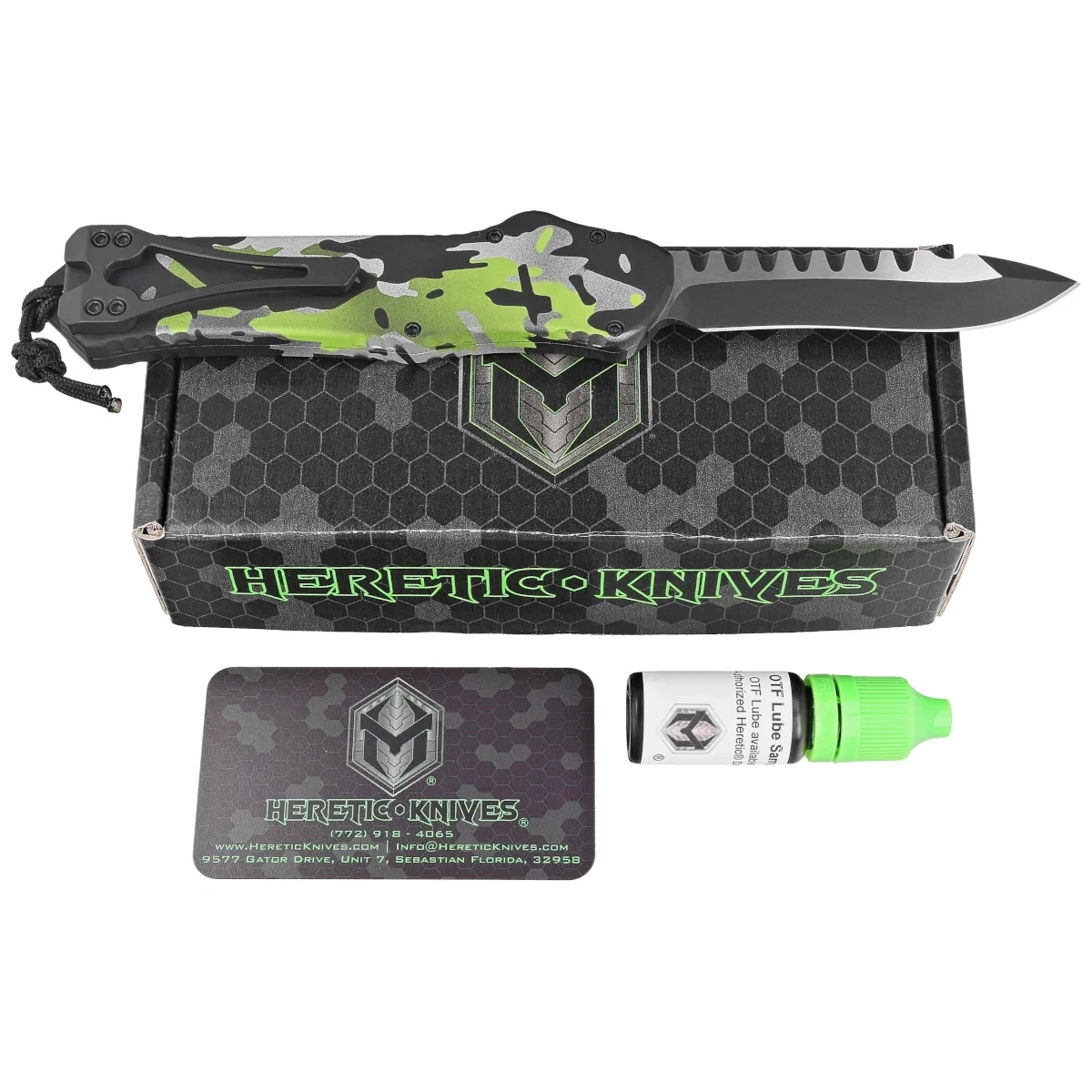 Hydra R/E Heretic Camo Aluminum, Black DLC/Satin, one of the most refined OTF (Out The Front) automatic knives on the market. An exceptional knife, created by Anthony Marfione Jr., owner of Heretic Knives, a symbol of excellence and precision. The construction, in 6061-T6 aluminum, emphasizes its elegance and strength, the blade, made of what is now considered the best steel for CPM MagnaCut knives, providing excellent cutting properties. The knife's opening mechanism, operates in S/A (Single Action) mode with tremendous force and power, allowing the blade to open instantly and securely. This is a feature that sets the Hydra R/E apart from other automatic knives. However, what really sets this knife apart is its superior fit and finish. Every detail, from the Handle to the blade, has been designed with comfort and functionality in mind. The knife's ergonomic Handle is designed to provide a secure grip, and its weight helps absorb energy when opening. The Hydra R/E is not just a knife, it is a work of functional art. Its unique design and exceptional quality make it a product that deserves a place in any knife collection. It is a true symbol of luxury and sophistication.