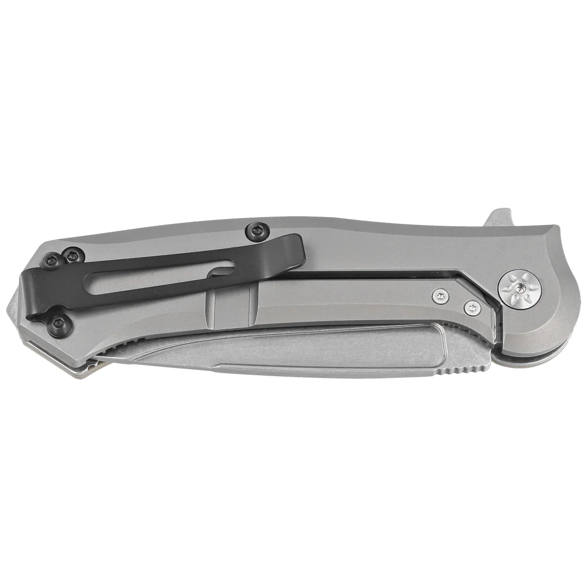 Blade - drop point type finished with anti-reflective and scratch-masking Stonewashed fine pebbles bath. The generous belly extends the length of the cutting edge relative to the length of the Blade converging towards the needle-sharp tip of the knife in combination with the high, flat grind gives excellent cutting properties. The blade is set on ball bearings supporting the work of the opening mechanism, which allows you to efficiently unfold the folder with the flipper lever. A milled recess in the blade reduces weight and increases strength, and can also be used to open the knife. A notched section of the Blade's back, the spine jimping ramp positions the thumb, giving solid support, making it easier to operate the knife. The whole thing is locked with the proven frame lock.