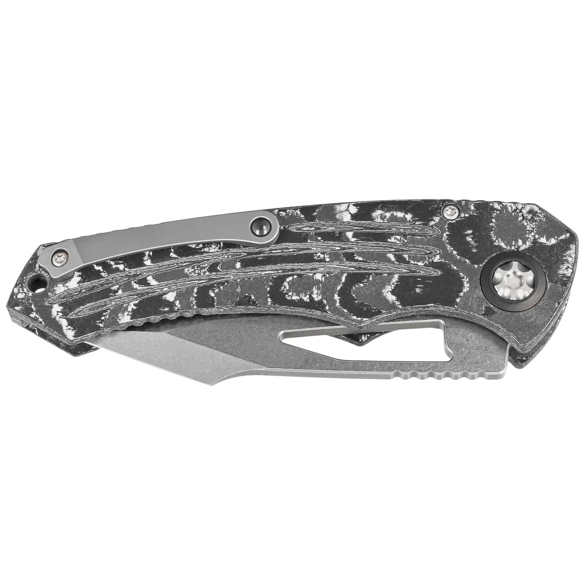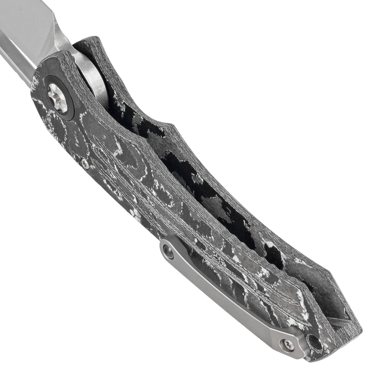 Handle - precisely made on CNC milling machines from White Camo Carbon Fiber, the surface texture makes the knife does not slip in the hand during use. There are notches (jimping) on the edges of the Handle to improve grip. The pivot axis decorated with a designer screw and a decorative ring around the pivot, the so-called pivot collar. Milled, single-position (right) titanium deep-carry clip allows to carry the knife in tip-up position. Equipped with a smooth rollerball, thanks to which the knife easily slides into the pocket without damaging the edges of the pocket.