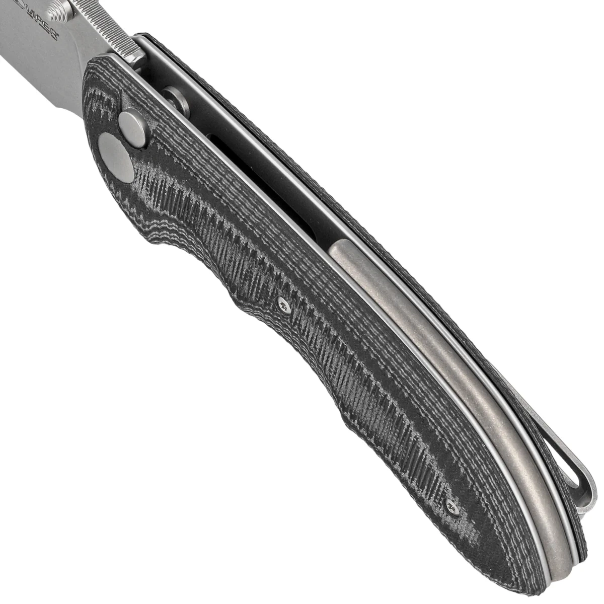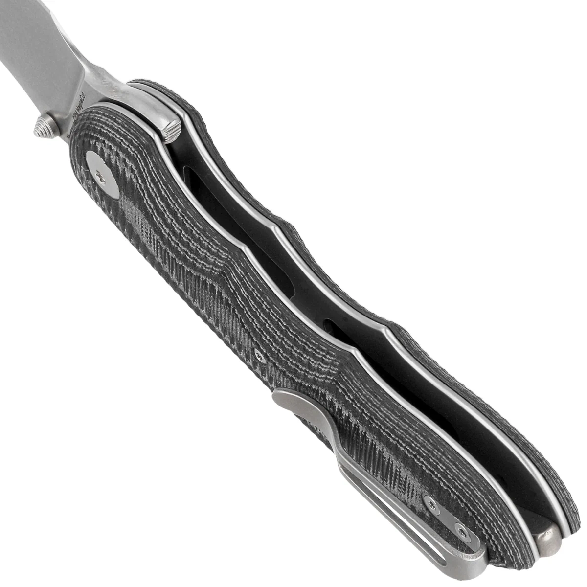 Handle - grips made of innovative Suretouch composite, a combination of G10 and rubber. They provide a secure grip at all times, even with slippery hands. Textured for improved grip confidence, they are bolted to the knife's steel frame. The titanium backspacer guarantees the rigidity and strength of the entire structure. The simple, sturdy construction gives you the assurance of many years of use. A single-position (right) titanium clip allows you to carry the knife discreetly in your pocket in tip-up (blade tip up) position.