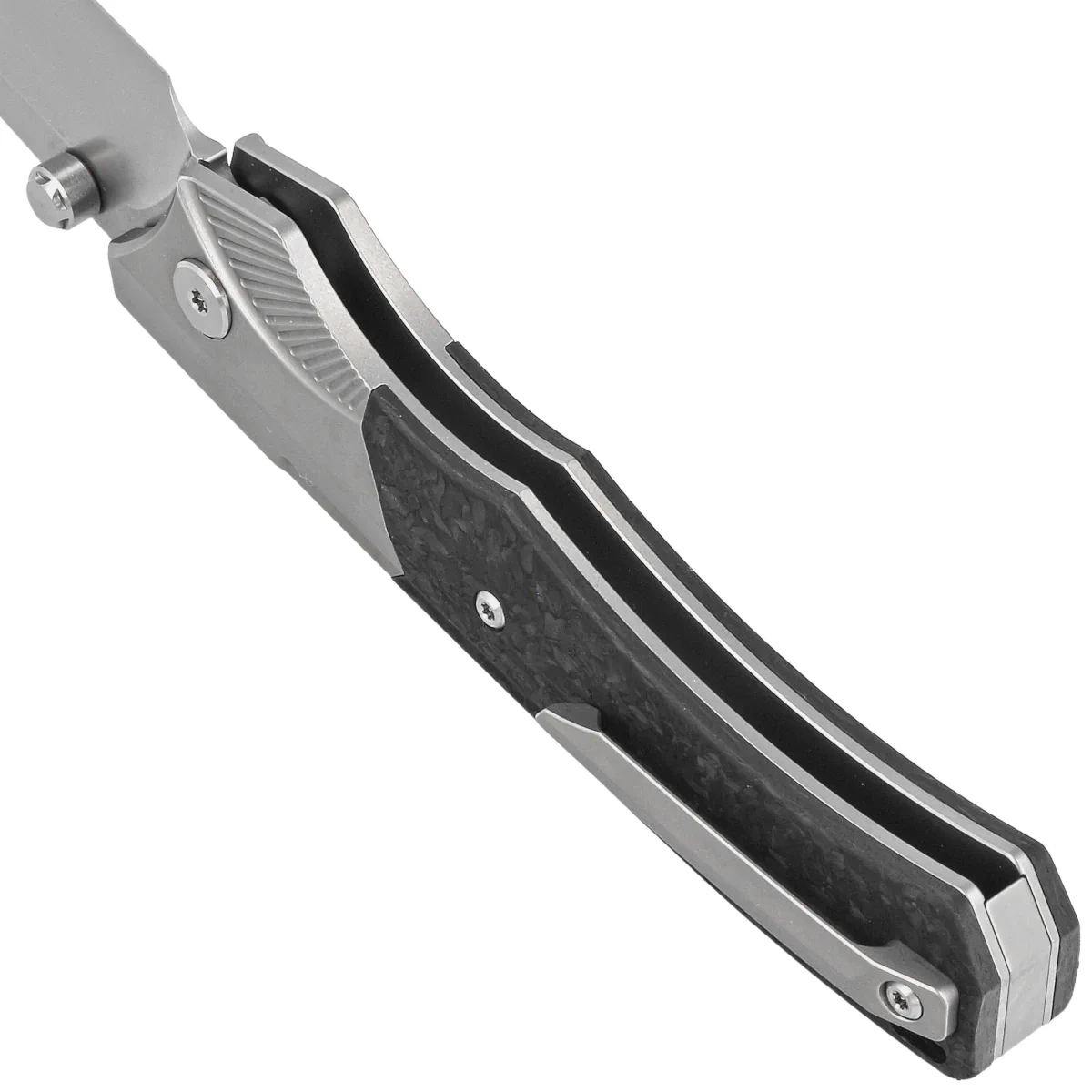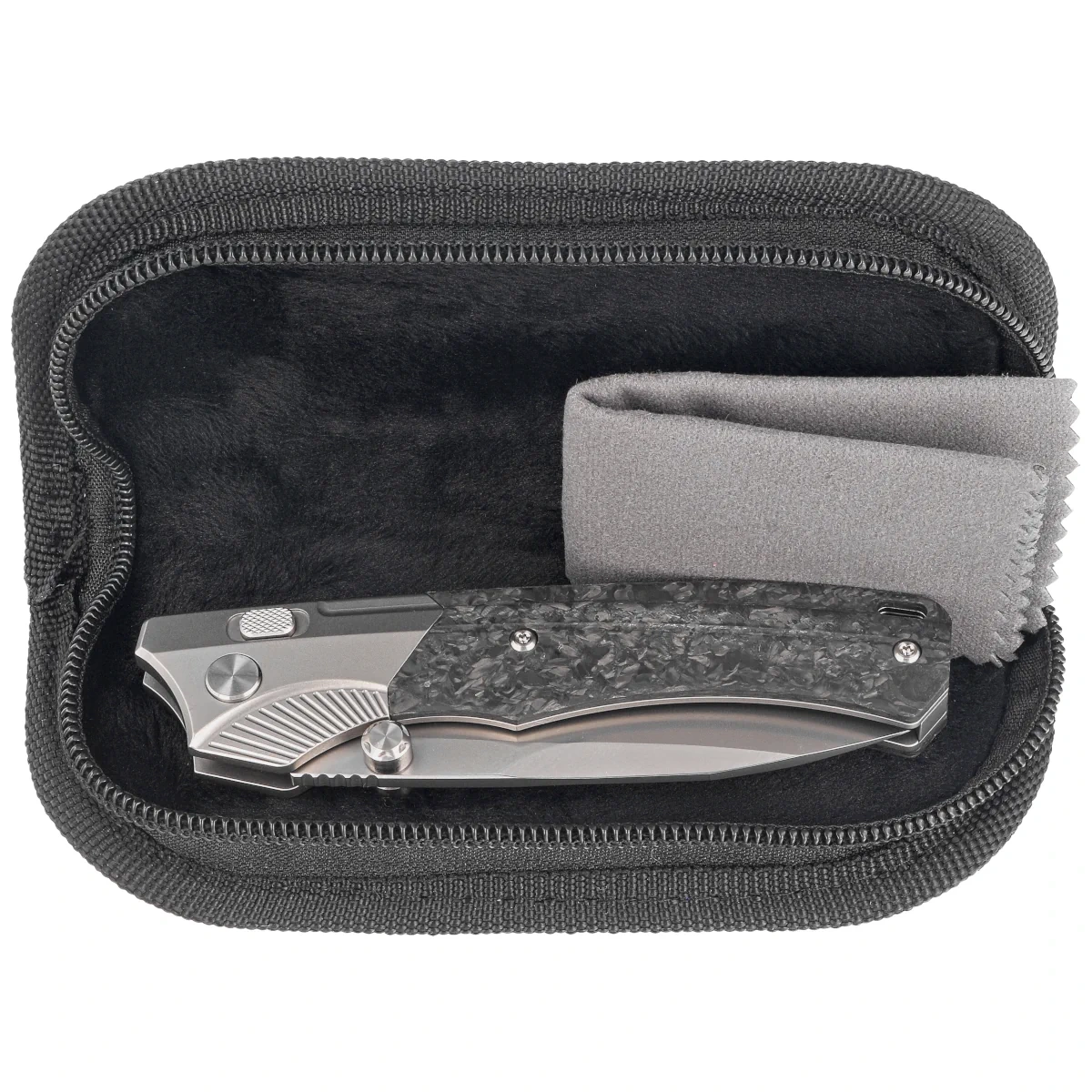 Handle - bolsters made of 6AL4V titanium, handle made of Carbon Fiber, carbon fiber compressed under pressure with synthetic resin. Chamfered edges of the covers eliminate sharp edges. The grips are screwed to a solid titanium backspacer, giving confidence that the desired stiffness of the overall design will be maintained. On the left side, a wide Button Lock button, placed in a recess to avoid accidental opening. A single-position (right) titanium deep-carry clip allows you to carry the knife discreetly in your pocket in tip-up position (blade tip up). Above the clip is a hole (Lanyard hole) for threading a safety or decorative cord.