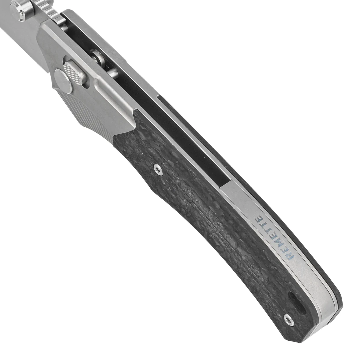 WD107 Gray Titanium / Carbon Fiber, Hand Grinding Pearlescent an exceptional folder designed by Remette Knives, which combines extraordinary build quality with functionality ideal for everyday use. The handle is a unique combination of titanium bolster and Carbon Fiber composite grips. The knife's blade is made of top-quality Böhler M390 steel with excellent wear resistance, corrosion resistance and long-lasting sharpness retention. This makes the WD107 ready for challenges, whether you use it in the kitchen, hiking or for everyday tasks. The size is appropriately sized for everyday carry. It's neither too big nor too small - perfect for tucking into a pants or jacket pocket. It is not only a tool, but also a sophisticated addition to your collection. Its quality, durability and functionality will make you love it for a long time.