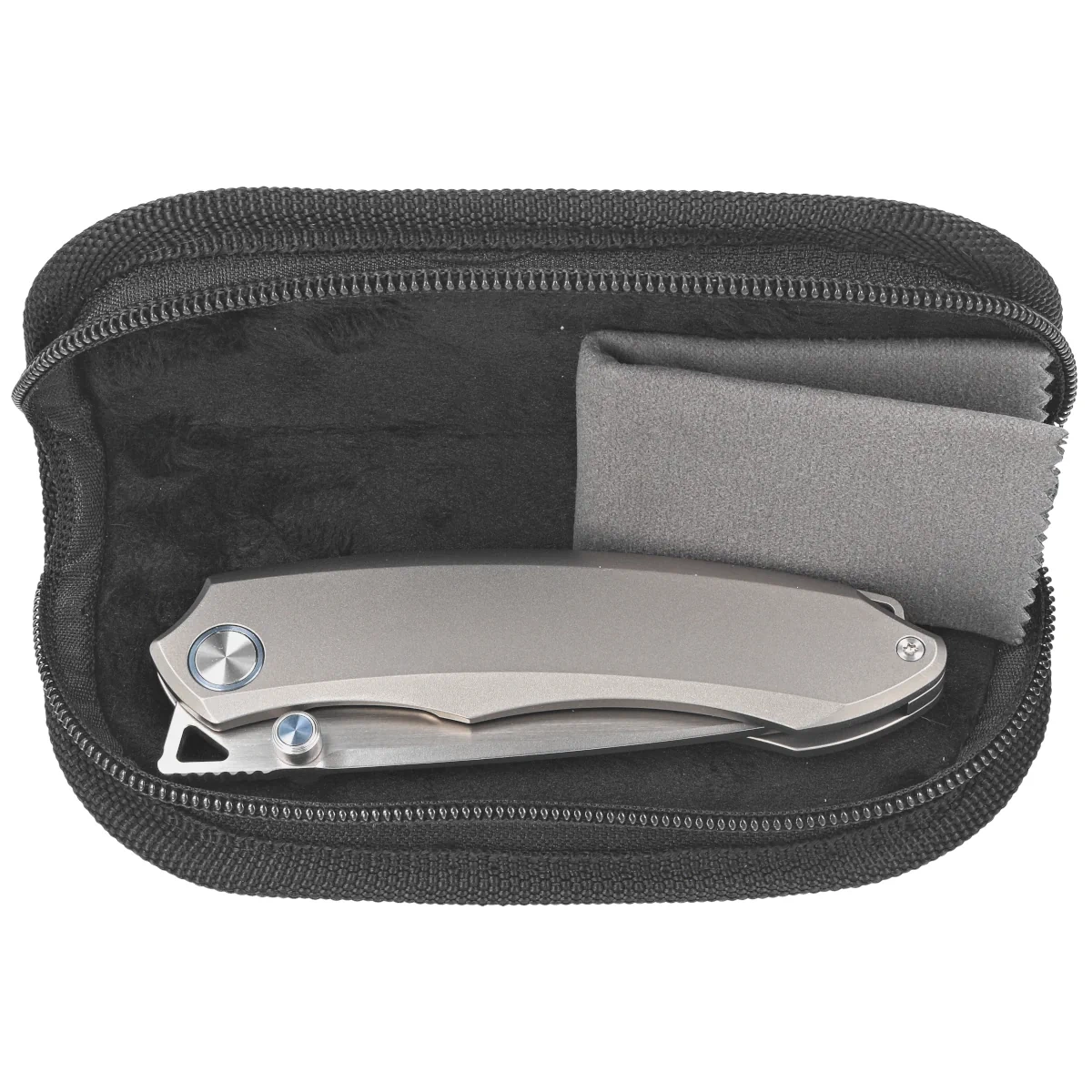 Handle - thick pieces of sandblasted titanium 6AL4V, beautifully milled with the help of CNC machine tools . The titanium backspacer to which the grips are attached guarantees the rigidity and strength of the entire structure. The simplicity and solidity of the construction give the assurance of many years of use. The single-position clip (right), made of titanium, allows the knife to be carried in tip-up position. The pivot axis is decorated with a rim made of dyed titanium (pivot collar cap). In the protruding part of the backspacer you will find a place for threading a safety or decorative cord.