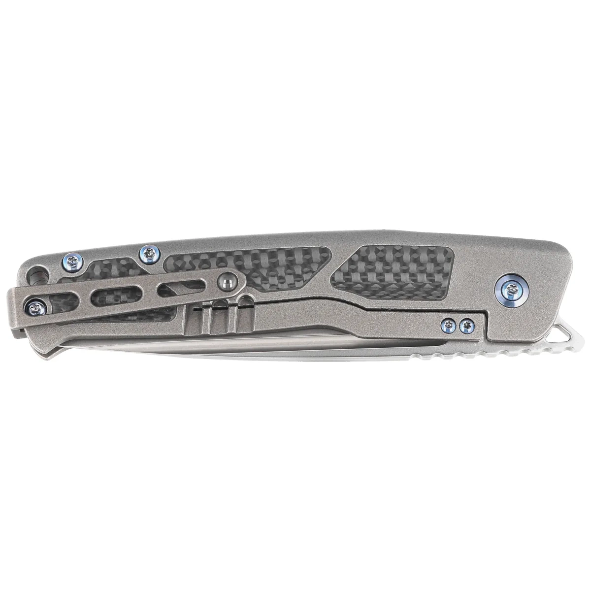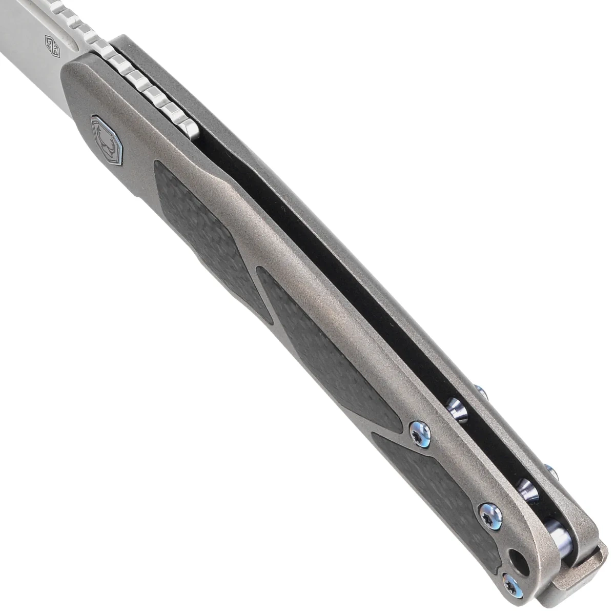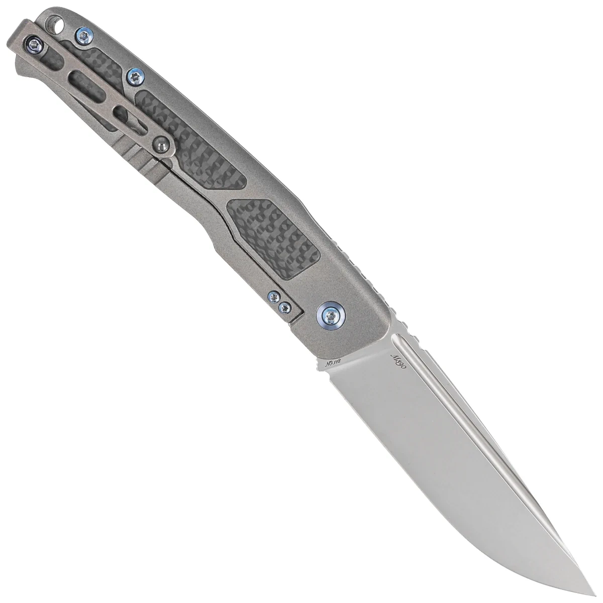 Handle - is a thick piece of titanium 6AL4V, the contouring of the covers eliminates sharp edges. On both sides there are inlays (inserts) made of Carbon Fiber composite. The open-backed design fixed with titanium spacer sleeves reduces weight and facilitates cleaning. The simplicity and robustness of the design give assurance of many years of use. Two-position clip (right/left), made of titanium, equipped with a smooth rollerball, thanks to which the knife easily slides into the pocket without damaging its edges, allows you to carry the knife discreetly in your pocket in tip-up position (blade tip up). The pivot is decorated with a stylized knifemaker logo and, together with the screws, has been finished in blue.