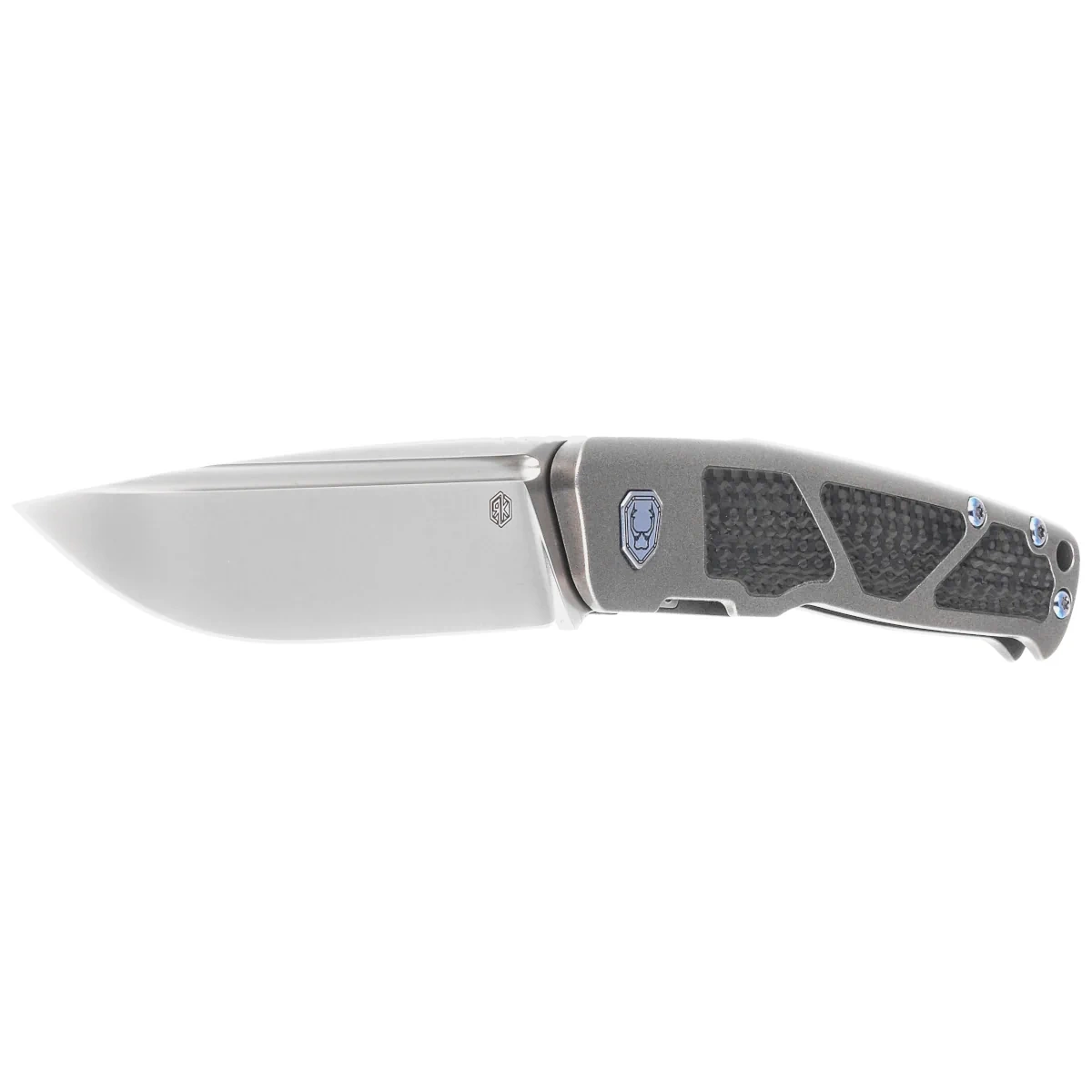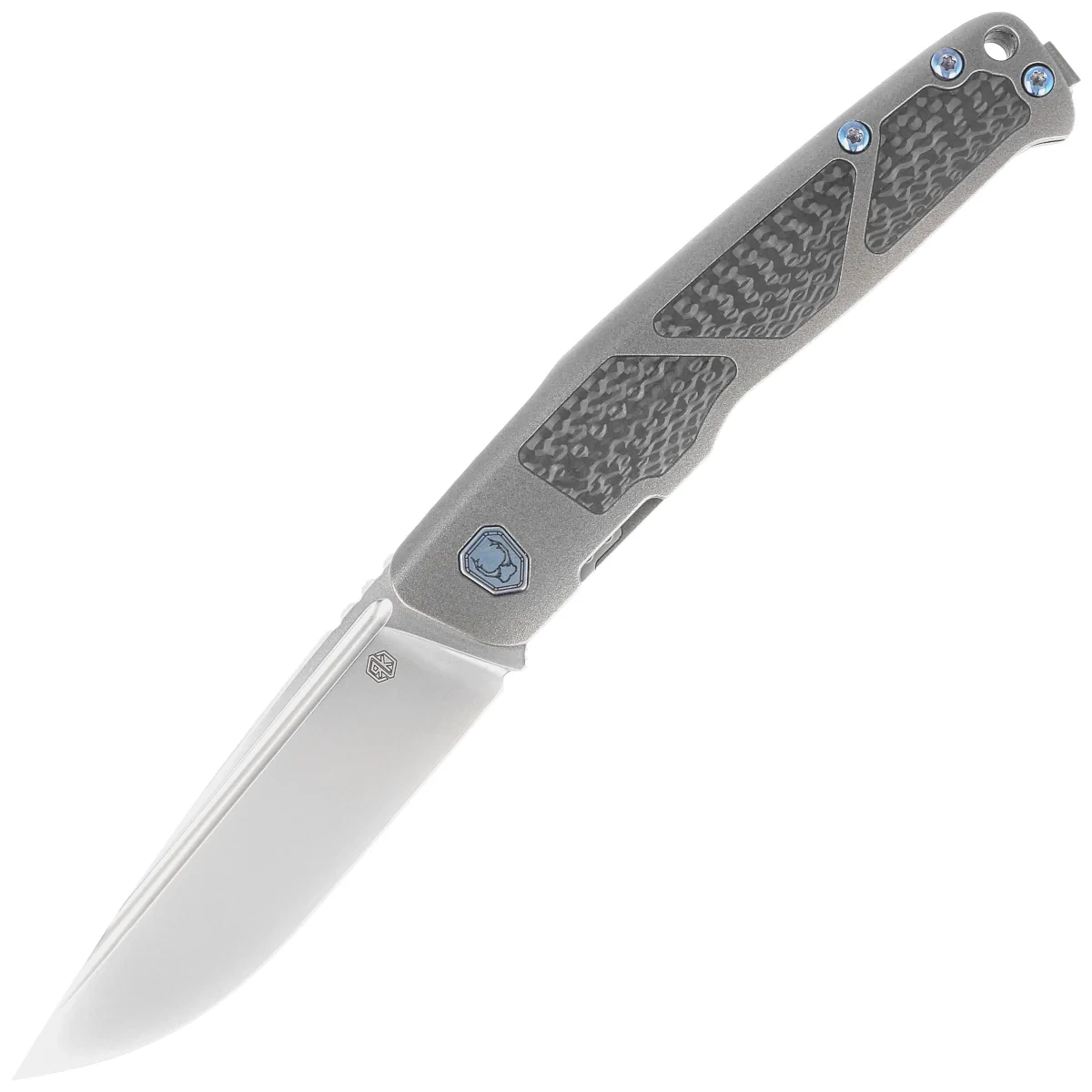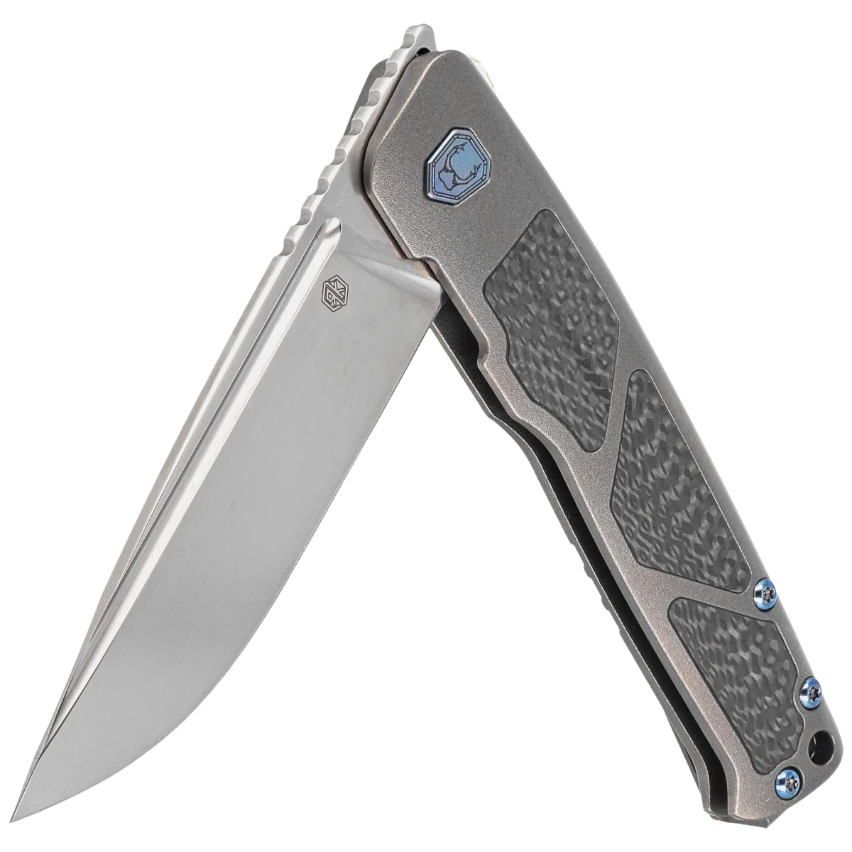 Handle - is a thick piece of titanium 6AL4V, the contouring of the covers eliminates sharp edges. On both sides there are inlays (inserts) made of Carbon Fiber composite. The open-backed design fixed with titanium spacer sleeves reduces weight and facilitates cleaning. The simplicity and robustness of the design give assurance of many years of use. Two-position clip (right/left), made of titanium, equipped with a smooth rollerball, thanks to which the knife easily slides into the pocket without damaging its edges, allows you to carry the knife discreetly in your pocket in tip-up position (blade tip up). The pivot is decorated with a stylized knifemaker logo and, together with the screws, has been finished in blue.