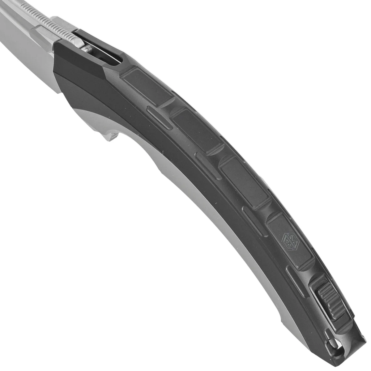 Handle - 6AL4V titanium exoskeleton on which is mounted a monolithic housing beautifully milled using CNC machine tools from a single piece of titanium. The innovative design provides outstanding solidity and resistance. In the rear part you will find a locking slide, thanks to it you have the possibility to remove the outer casing, for example, to clean the knife. Single-position (right) deep carry clip equipped with a smooth rollerball, thanks to which the knife easily slides into the pocket without damaging its edges, allows you to carry the knife discreetly in your pocket in tip-up position (blade tip up).