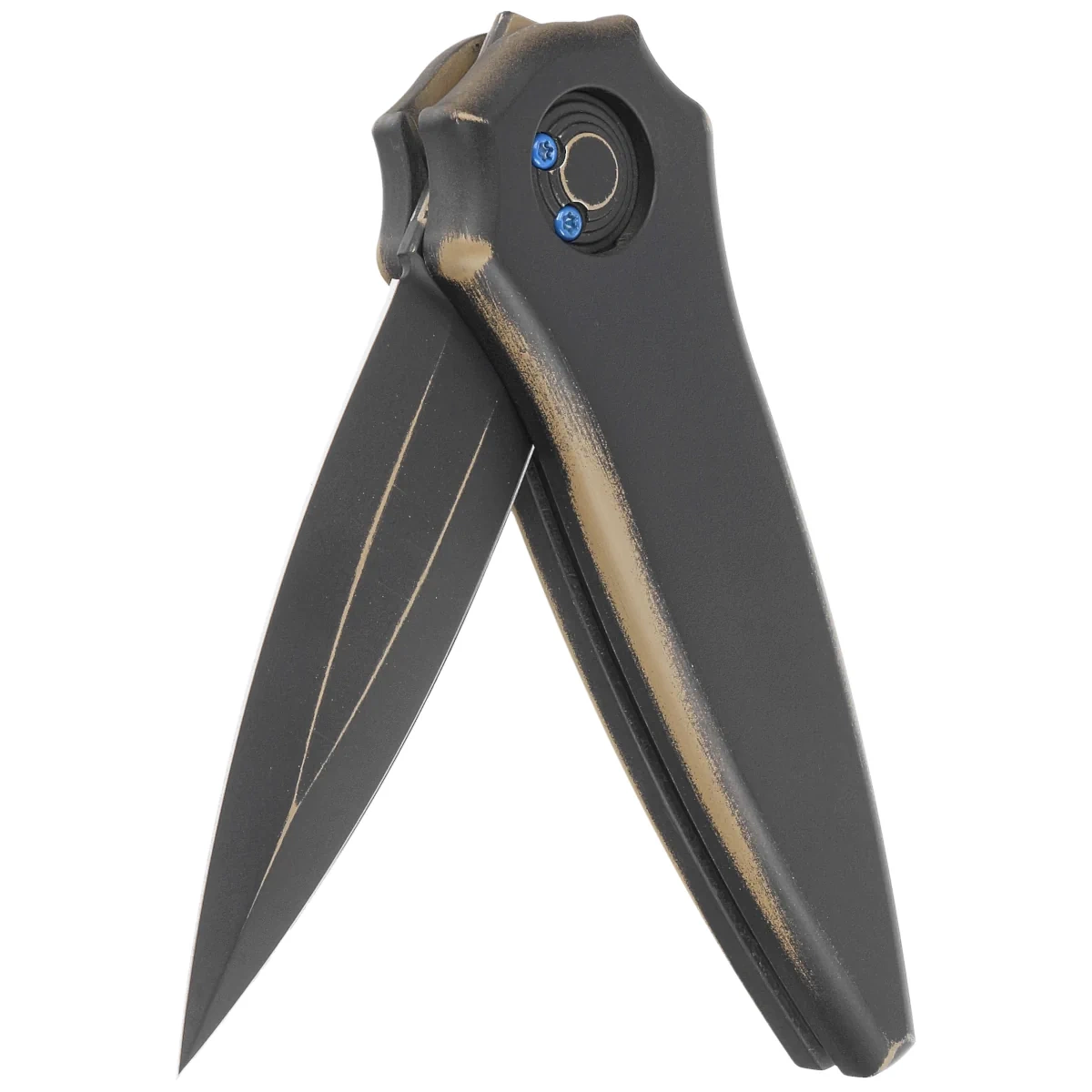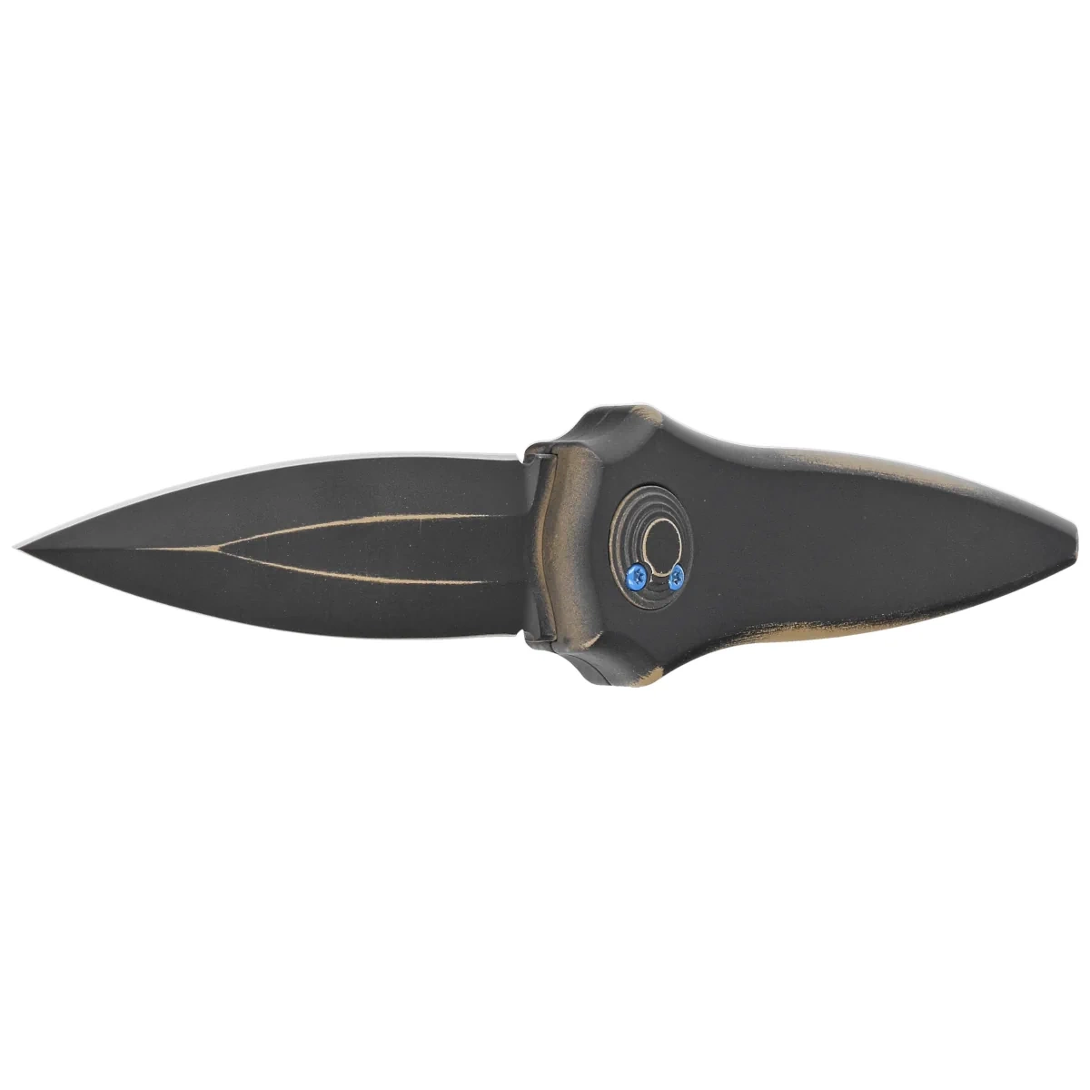TheWarlock-X Smooth Black Aluminum, Black Cerakote differs from traditional folding knives by using an innovative opening mechanism. The large, textured pivot serves as a dual locking button. By pressing both sides of the pivot at the same time, the Handle splits, exposing the Blade; through gravity and wrist movement, the Blade will slide out to the open position. This is a fun and innovative opening mechanism, effective and also provides a solid lock. The Warlock knows how to get down to business and will work as long as you want it to, but it's also capable of satisfying your thirst for fun. It's a knife you'll always be happy to have with you.