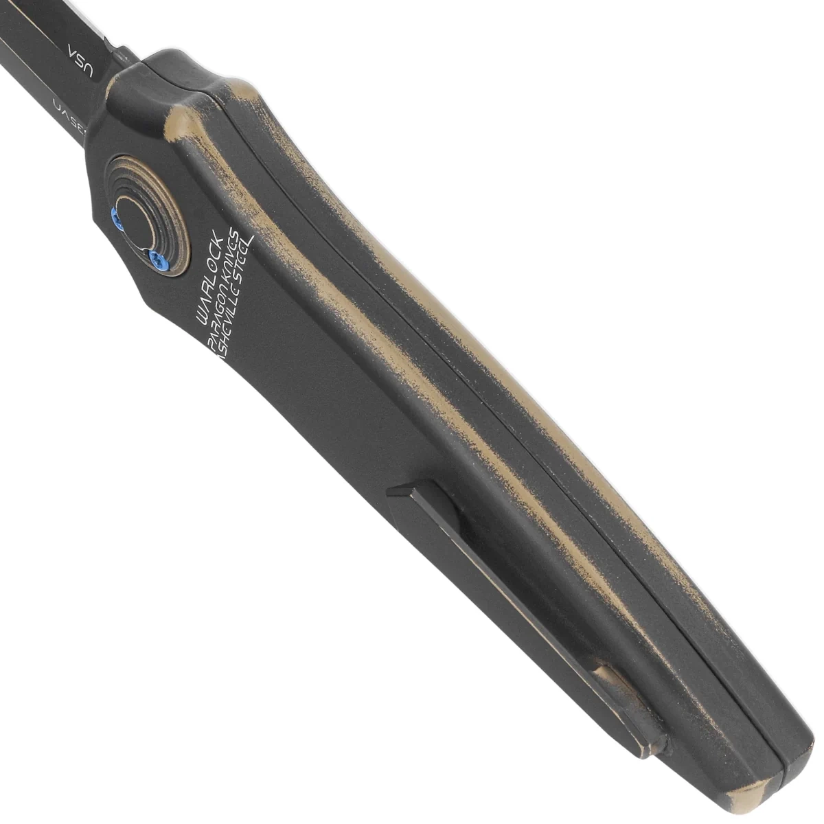 • Warlock-X Smooth Black Aluminum, Black Cerakote, a large folding knife with an unusual gravity opening method. Aluminum grips, blade made of proven S35VN steel. Made with pride by American craftsmen!
