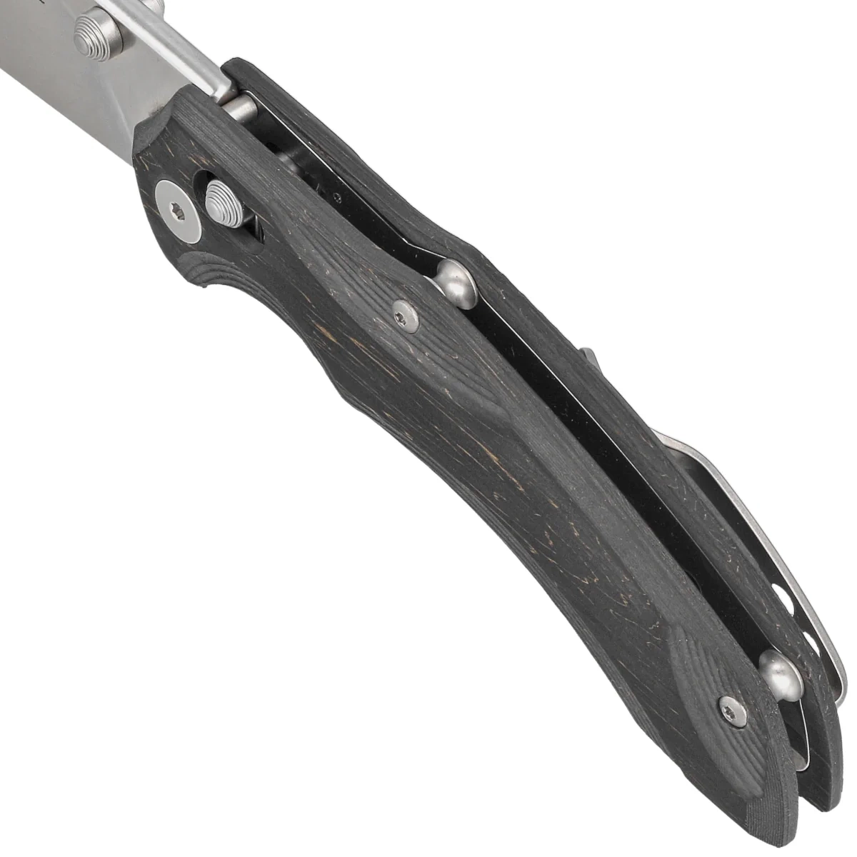 Handle - made of Light Carbon Fiber composite, a virtually indestructible plastic that is insensitive to weather, resistant to chemicals and mechanical damage, beautifully milled using CNC machine tools. The so-called open-backed design fixed with steel spacer sleeves reduces weight and facilitates cleaning. The simple, secure design gives assurance of many years of use. Single-position clip (right), made of titanium, allows the knife to be carried in tip-up position.