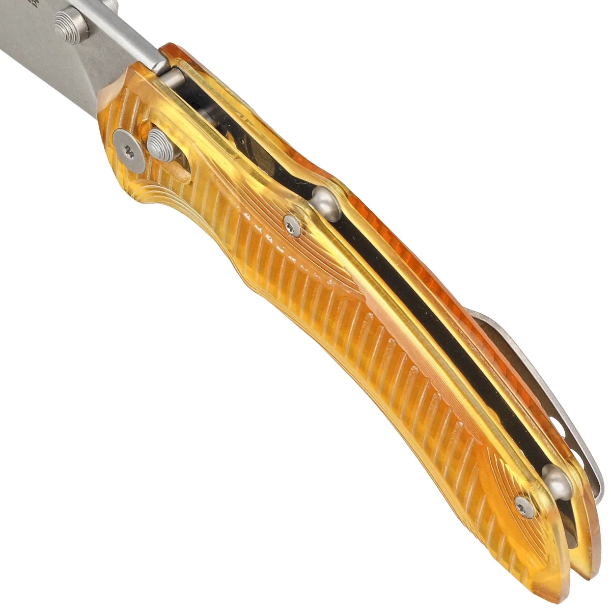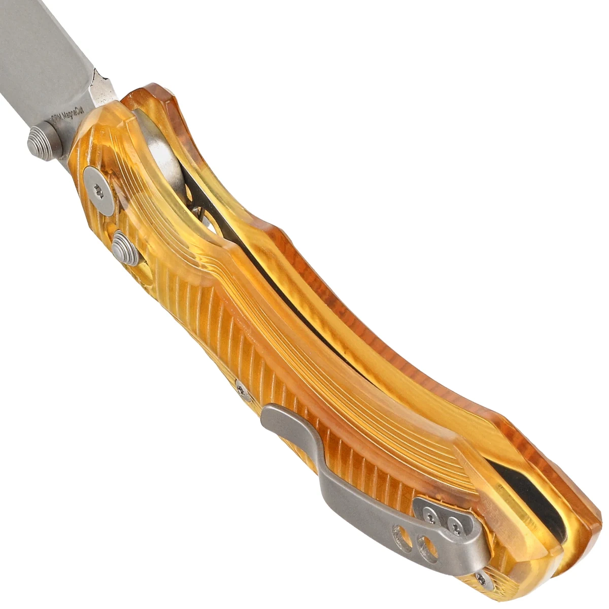 Handle - grips made of transparent Ultem™, a virtually indestructible material insensitive to weather conditions, resistant to chemicals and mechanical damage, beautifully milled using CNC machine tools. The open-backed design, fixed with steel spacer sleeves, reduces weight and facilitates cleaning. The simple, secure design gives assurance of many years of use. Single-position clip (right), made of titanium, allows the knife to be carried in tip-up position.