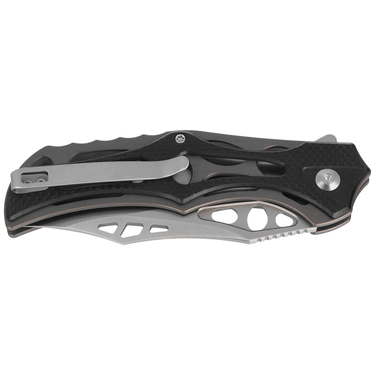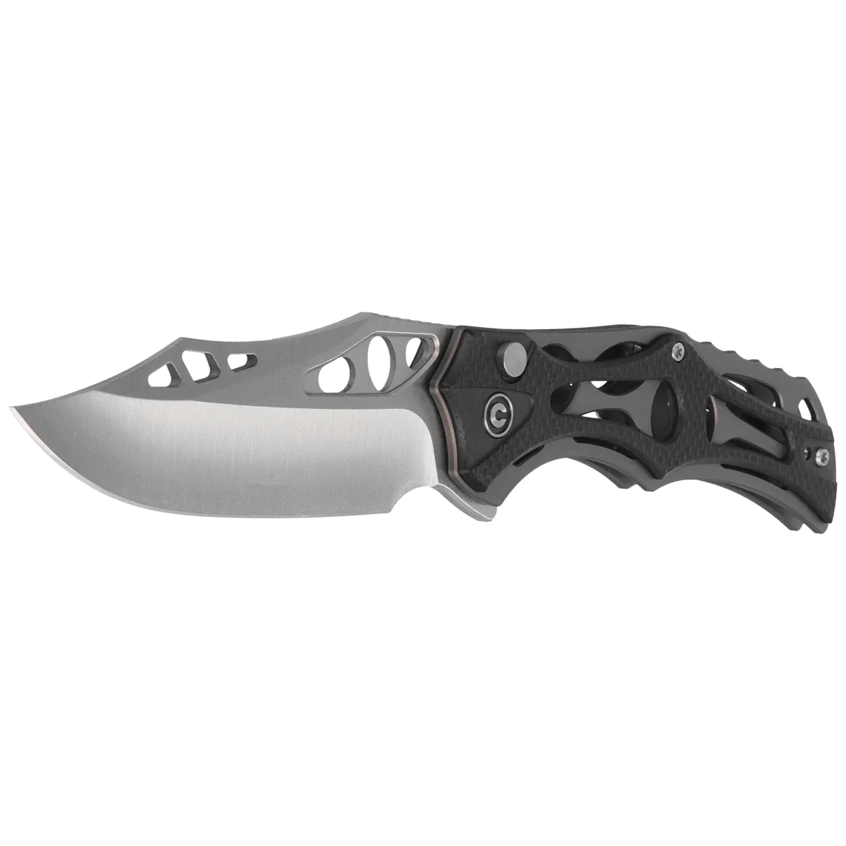 Handle - skeletonized, made of aluminum, to which heavily cut G10 composite grips were screwed. This gives the fingers plenty of support points for a secure grip. A fore finger groove made at the front improves ergonomics. The open-backed design, fixed with steel spacer sleeves, reduces weight and facilitates cleaning. The simple, secure design gives assurance of many years of use. Thanks to all these design measures, the full-size folder reaches a staggering 75g in weight. The pivot axis is adorned with a stylized Civivi brand logo . The two-position (right/left), deep-carry clip allows you to carry the knife discreetly in your pocket in tip-up position (blade tip up).