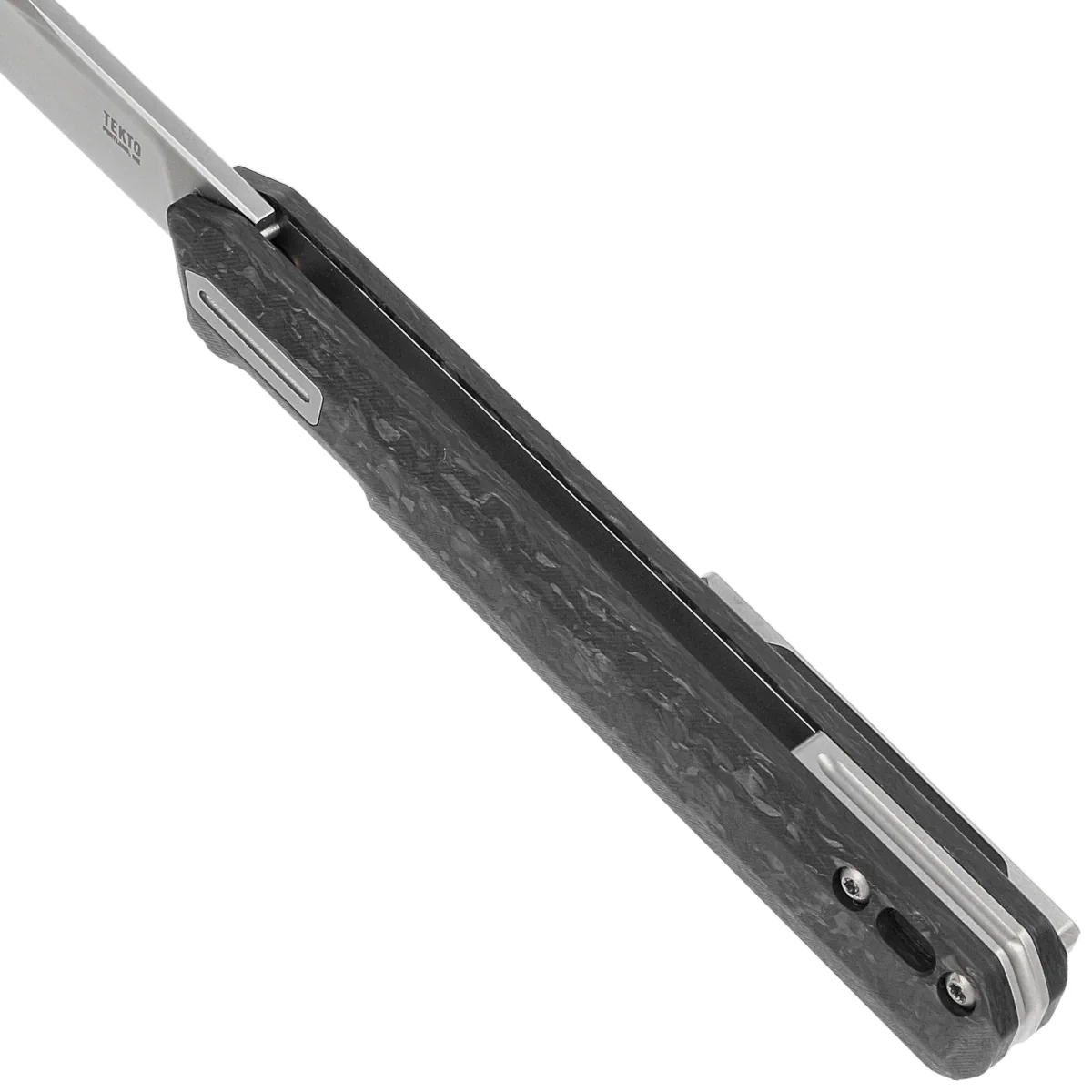 Tekto F2 Bravo Knife Black Forged Carbon Fiber, Silver HW/Clip, Satin D2
