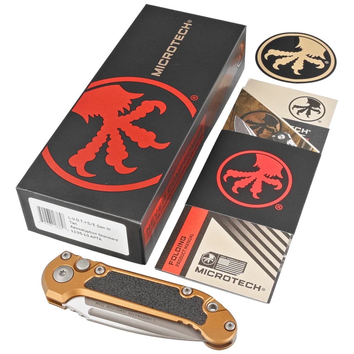 - LUDT Gen 3 S/E Tan Aluminum/3M Apocalyptic to meet the demands of special units operators has a powerful spring-loaded blade opening mechanism, unprecedented in knives of this size. The opening is designed to be as secure underwater and land.