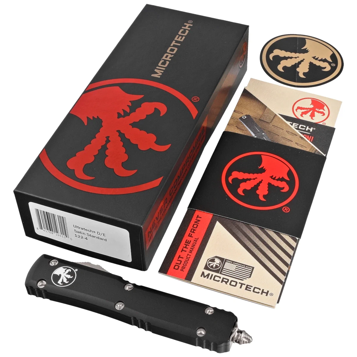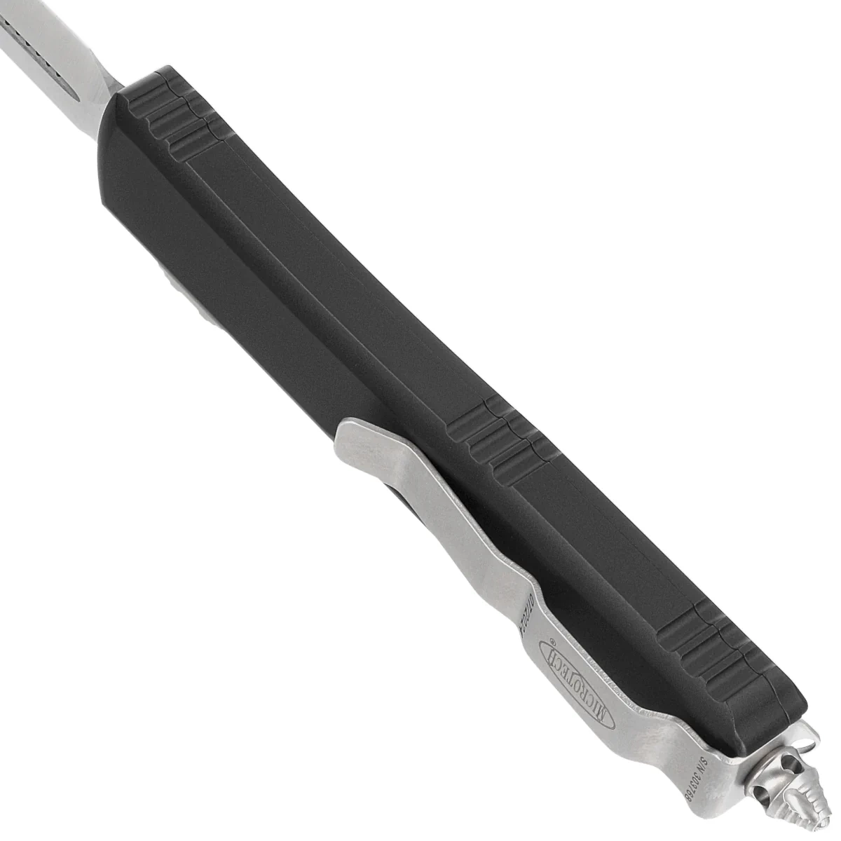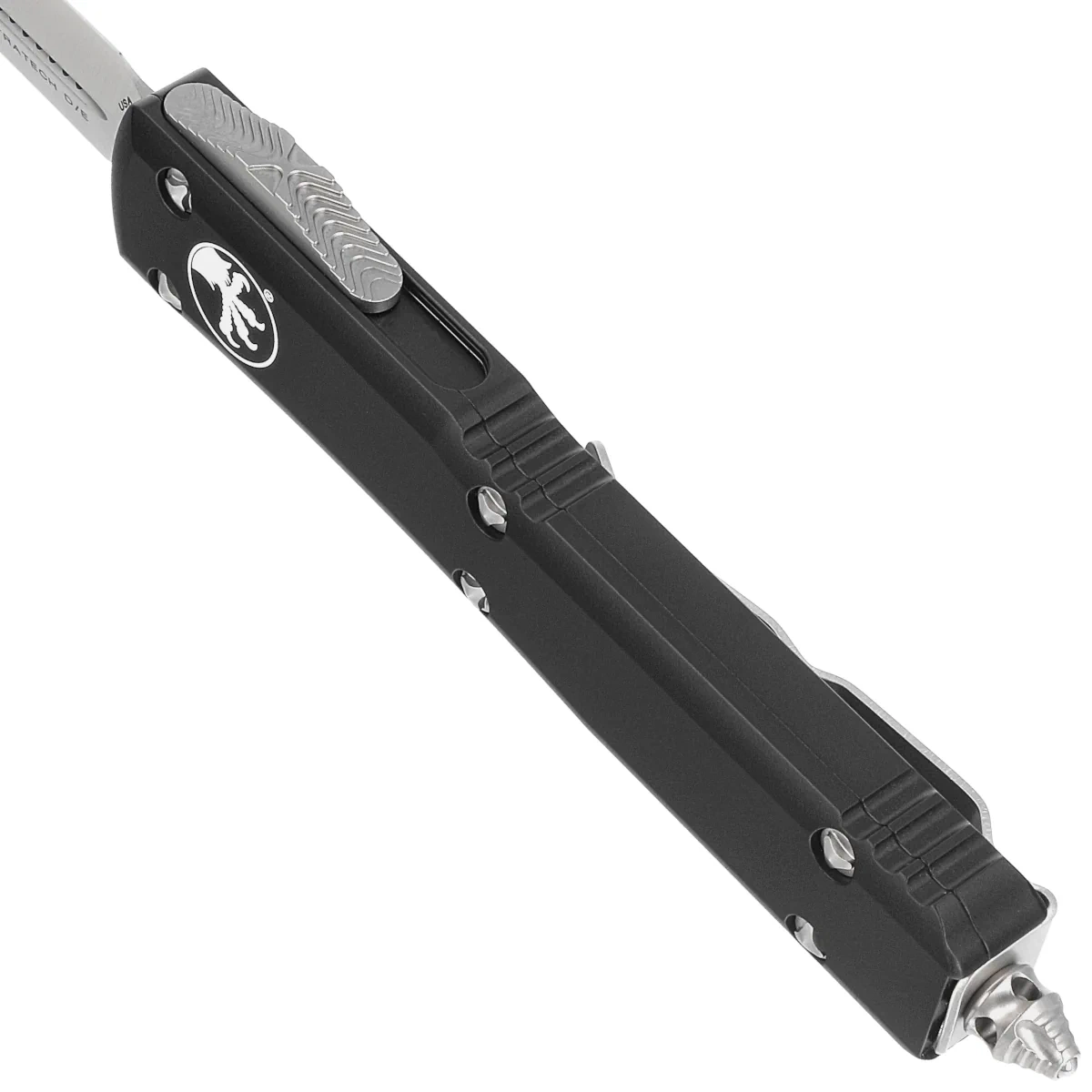 Ultratech D/E Black Aluminum, Satin is a full-size OTF (Out The Front) automatic knife from the Ultratech series. Featuring a hell of a fast extension mechanism with a razor-sharp double edge blade in a striking Satin finish. 100% made and assembled in the USA. Designed by Anthony Marfione, knifemaker and owner of Microtech Knives.