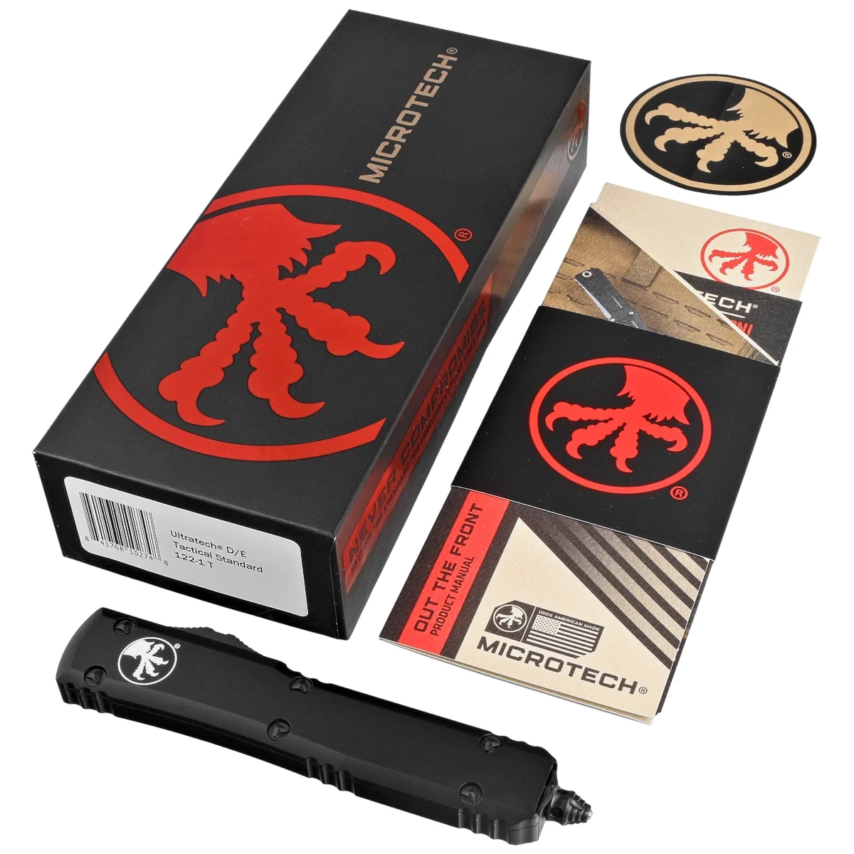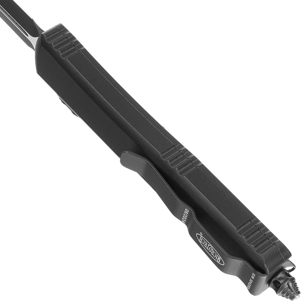 Ultratech D/E Black Aluminum, Tactical a full-size OTF  (Out The Front) automatic knife from the Ultratech series, featuring a tactical black blade finish. Equipped with a lightning-fast mechanism deploying a razor-sharp dagger blade. 100% made and assembled in the USA. Designed by Anthony Marfione, knifemaker and owner of Microtech Knives.