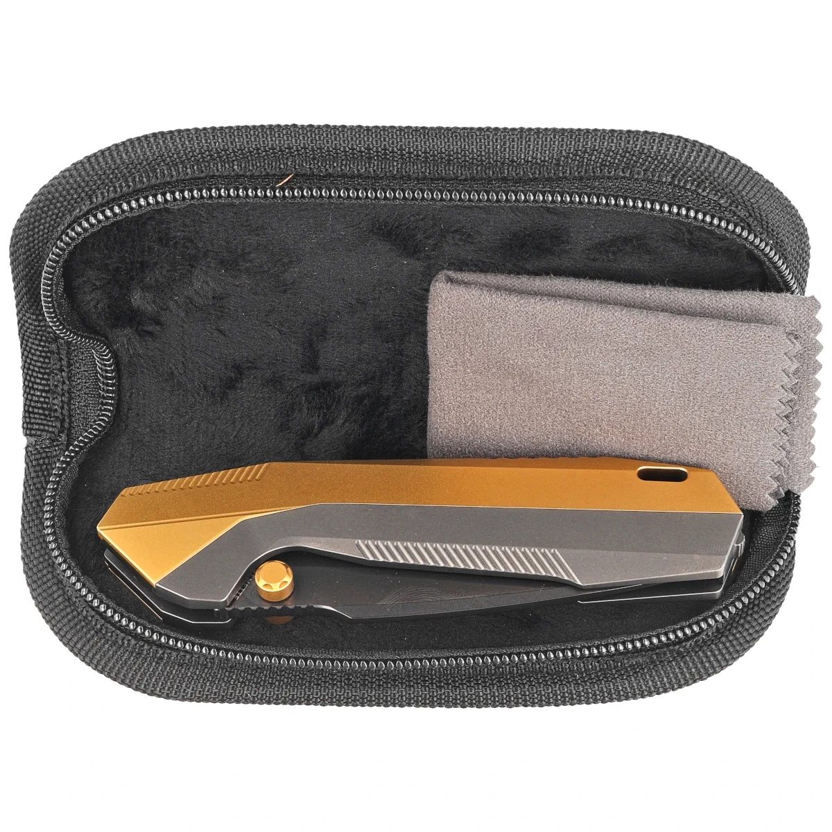 RT-WK1-C Disassemble Knife Golden/Charcoal Grey/DLC Titanium, DLC, a unique EDC folder, a display of engineering in design, combines excellent functionality with unique style. The handle is something that draws the most attention in this knife. It boasts a titanium exoskeleton on which the outer monolithic housing milled from a single piece of titanium is mounted. This design provides extraordinary strength and structural rigidity. The drop point blade is crafted from Böhler M390 steel, widely regarded as one of the best knife steels available. Flipper tab allows for lightning-fast one-handed knife deployment, which is especially useful in situations where every second matters. The folding knife is designed to be easily disassembled without the need for specialized tools. RT-WK1-C Disassemble Knife combines practicality with modern design, making it an ideal choice for blade enthusiasts who value the ability to maintain their knife themselves.