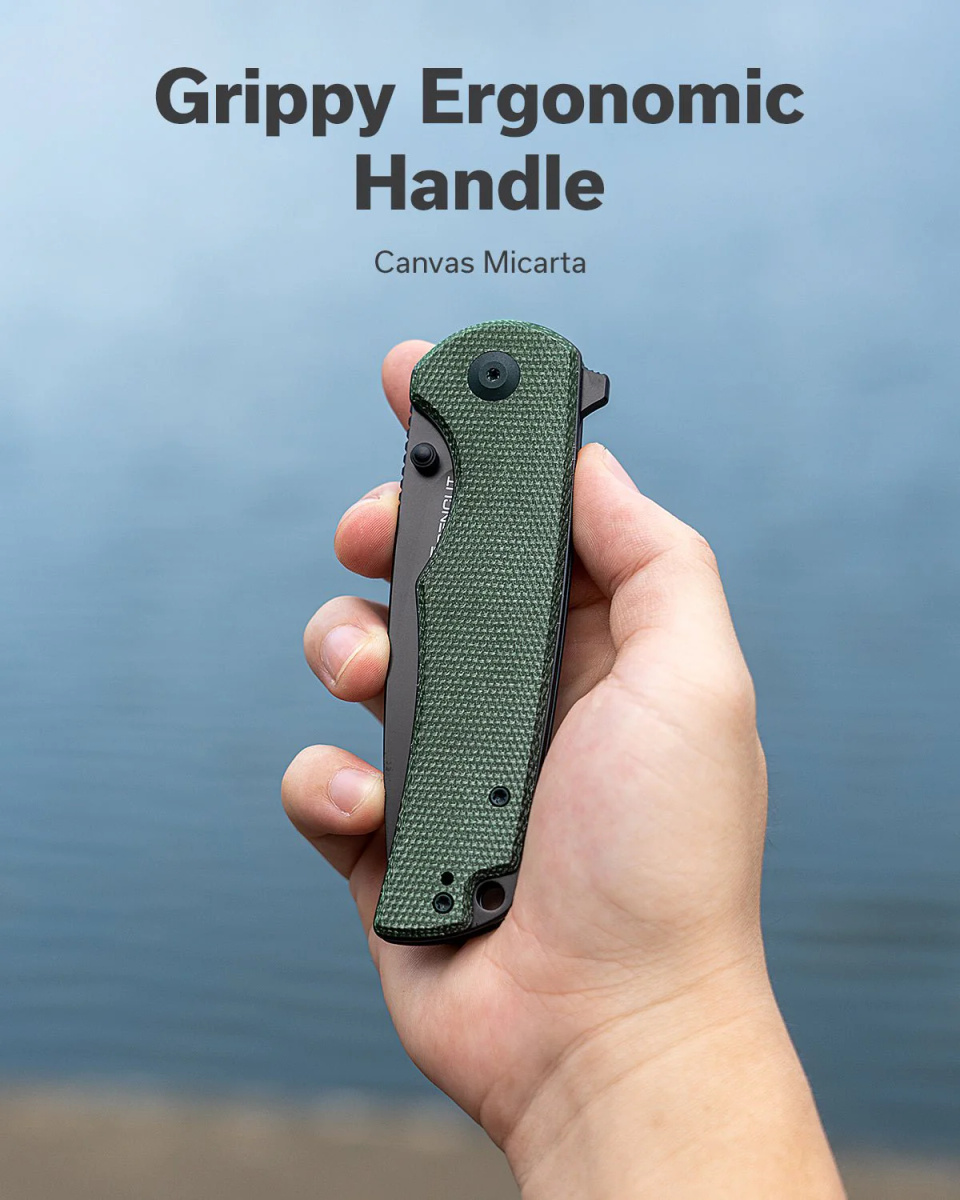 Praktisk Green Canvas Micarta, Black large folding knife for any EDC enthusiast . Drop point blade made of 9Cr18MoV stainless steel , Handle grips made of Canvas Micarta composite . Double-sided Thumb Stud, quick flipper (index-finger flipper) allow you to open the blade in two ways. Sturdy construction that will not disappoint. The perfect companion for everyday hikes! Bestseller!