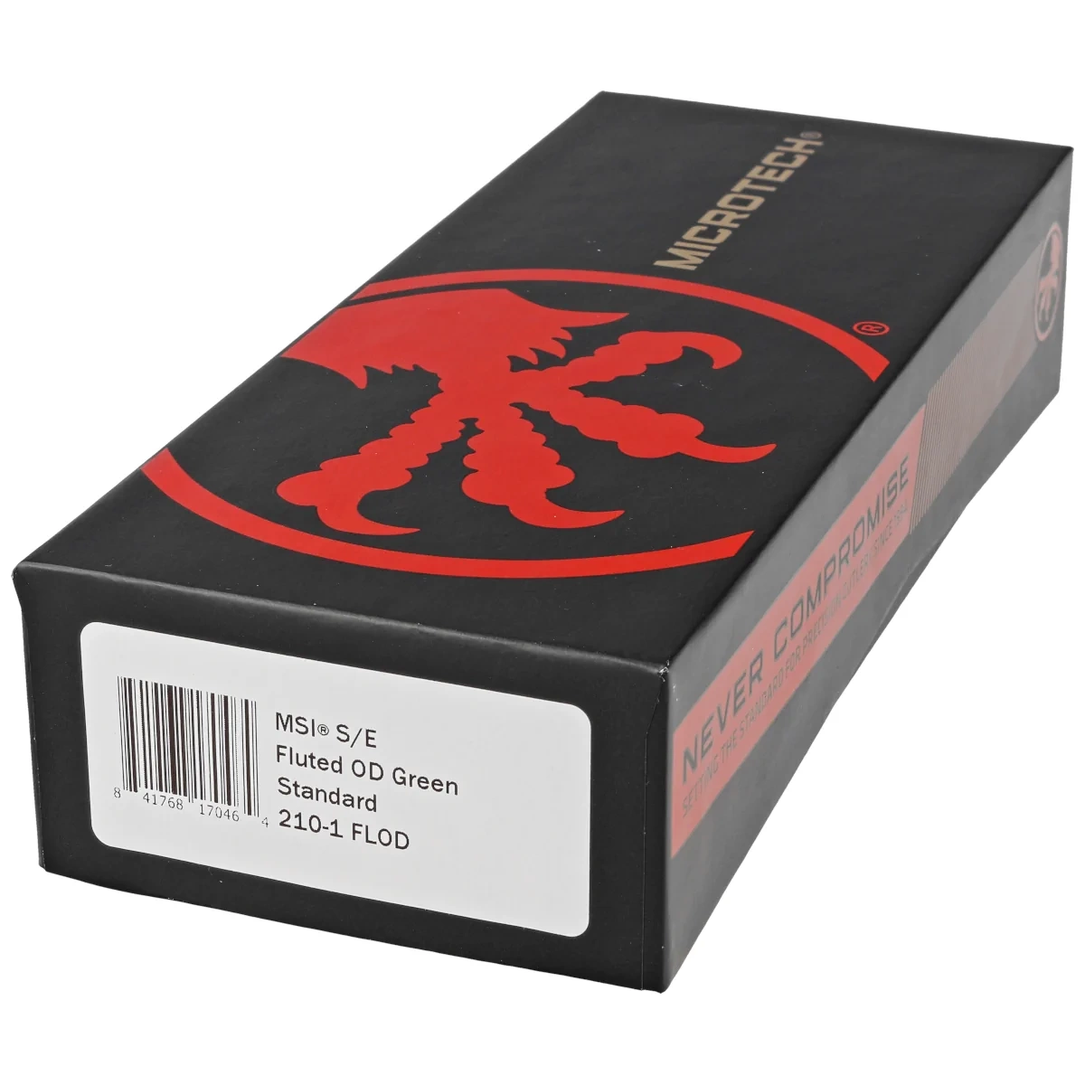 MSI S/E Fluted OD Green Aluminum, Black folding knife that combines strength, durability and elegance. Its blade is made of excellent M390MK steel , which is the result of a collaboration between two renowned companies - Microtech and Böhler. This steel is known for its exceptional strength and long sharpness retention, making this knife unafraid of any challenge. The intuitive RAM-Lock lock ensures safety during use. This innovative lock is easy to operate and provides ease of use for both right and left-handed people. The Handle of the knife is made of aluminum, durable and ergonomic. Its shape is designed to fit perfectly in the hand, ensuring comfort even during prolonged use. This knife is not only a tool, but also a work of applied art. Its designer, Anthony Marfione, founder and owner of Microtech, has taken care of every detail. From the elegant finish to the satin details, this knife is both beautiful and practical. Whether you're looking for a reliable tool or an elegant accessory, this knife will meet your needs.