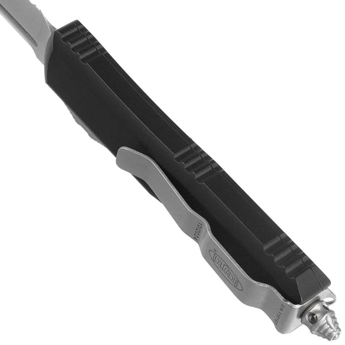 Handle - made with excellent precision in 3D technology on CNC milling machines, from Mil-Spec hard-coated 6061-T6 aluminum. The surface texture of the Handle makes the knife non-slip in the hand during use. There are notches (jimping) on the back and bottom of the handle for a more secure grip. The slim profile and milled two-position (right/left) solid deep-carry clip allow the knife to be carried discreetly in the pocket, in tip-down (blade tip down) position. The clip bears the Microtech logo, serial number and production date. The Handle is finished with a glass breaker, a solid steel triangle into which a tungsten carbide ball has been pressed. It also features a hole for interweaving a decorative cord.