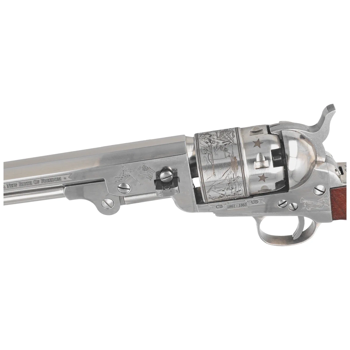 1851 Colt Navy Yank Steel London Gettysburg Old Silver .44 - a limited edition of Pietta revolvers from the DeLuxe series, commemorating the Battle of Gettysburg, one of the bloodiest engagements of the American Civil War. This pivotal battle marked the downfall of the Confederate forces. This extraordinary weapon, an icon of the Wild West, features laser-engraved designs including battle flags and insignia of Union and Confederate cavalry, quotes from Abraham Lincoln—"A house divided against itself cannot stand" and "This nation, under God, shall have a new birth of freedom"—along with the date of the Battle of Gettysburg. Unlike standard Colt Navy revolvers, the cylinder engraving portrays the Battle of Gettysburg instead of the Battle of Campeche.
