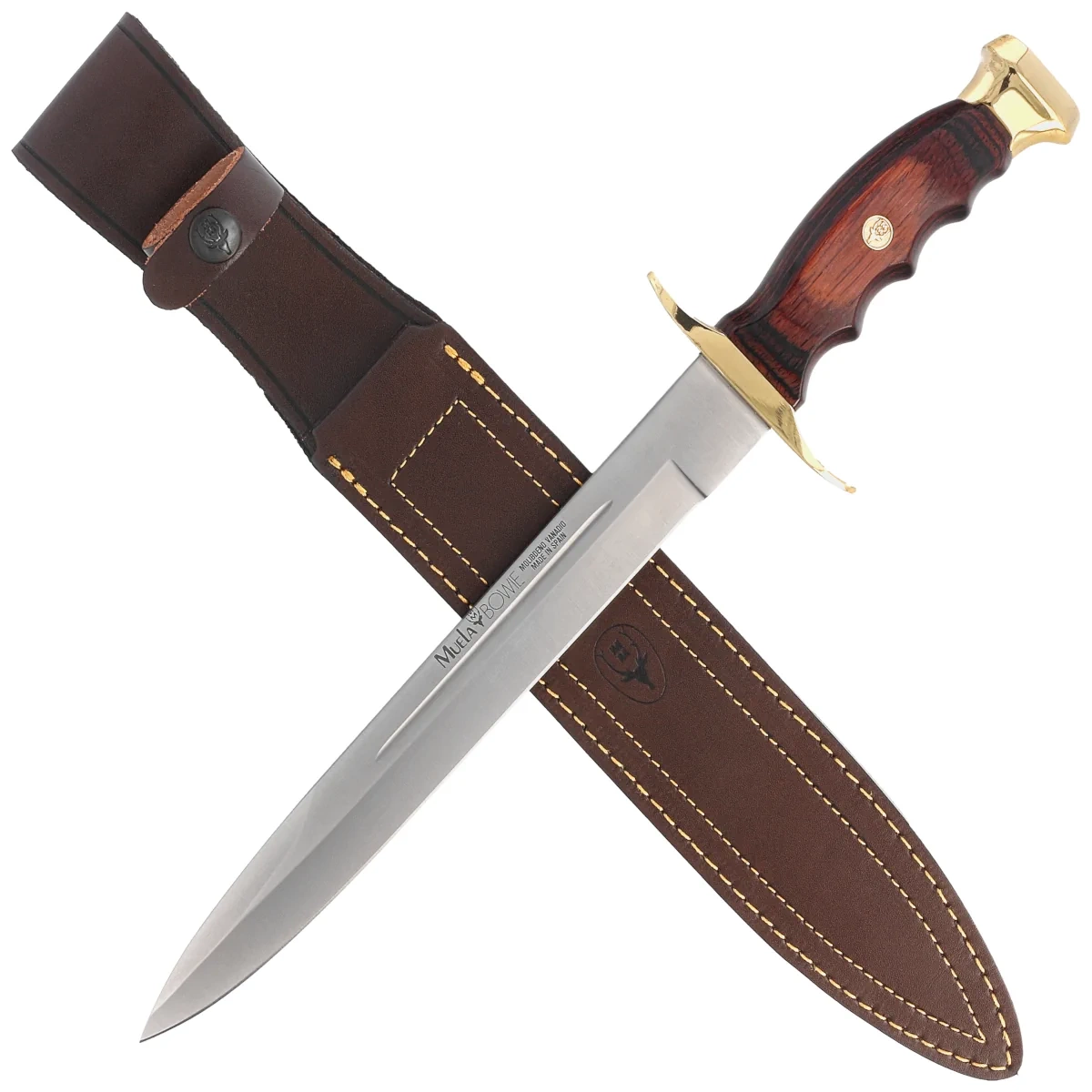 - BW-26 fixed blade knife crafted from molybdenum-vanadium (MoVa) steel, designed for versatile outdoor tasks. Features unique patterned handles made from synthetic coral pakka wood, accented with brass pommels. Includes a hand-stitched leather sheath.