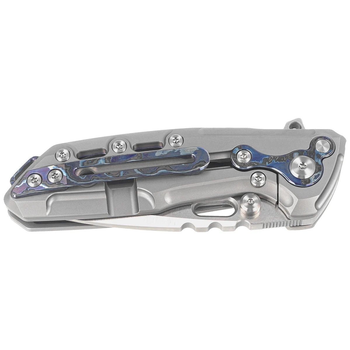 Handle - made of solid titanium 6AL4V, perfectly milled on CNC machine tools. Contouring of the covers eliminates sharp edges. On both sides there is an inlay (insert) made of Zircuti (damast made of titanium and zirconium). Only a few companies are able to make the Handle with such incredible accuracy! The grips were joined together using a backspacer made of Zircuti. The single-position clip (right), from Zircuti, allows the knife to be carried in tip-up position. On the back, a slide releases an additional lock in the form of two steel cylinders located above the pivot. The lock also works when the knife is closed, preventing accidental opening. The protruding section of the backspacer can be used as an improvised glass breaker and also has a hole for a safety or decorative cord.