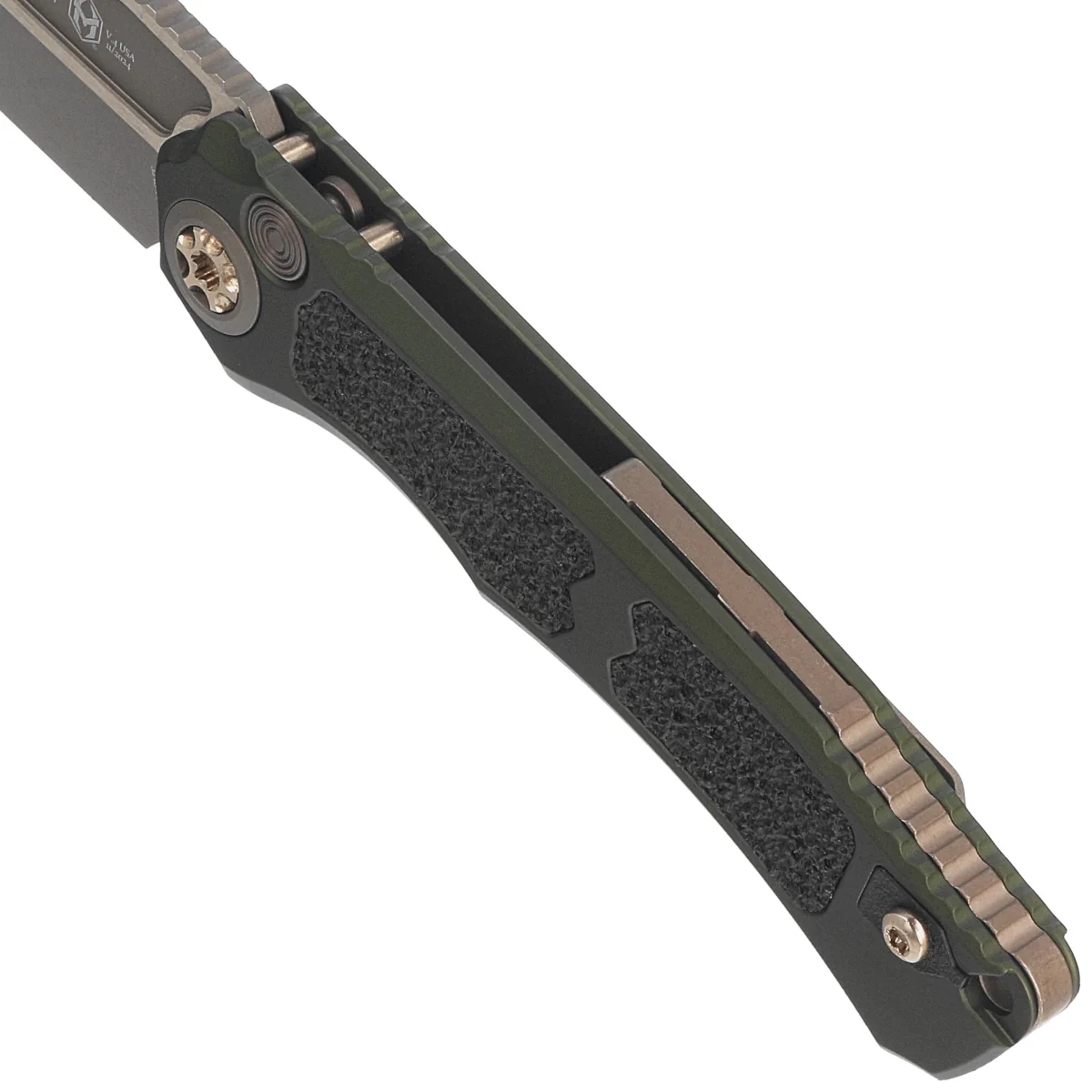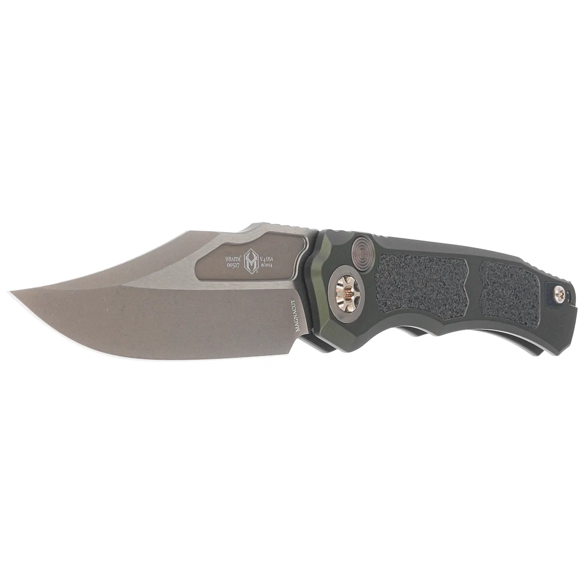 • Wraith V.4 Auto Green Aluminum/3M, Bronze Stonewashed, powerful automatic switchblade type designed by Tony Marfione Jr. Built for demanding users, it features robust aluminum scales and blade crafted from premium MagnaCut steel. An outstanding tool!