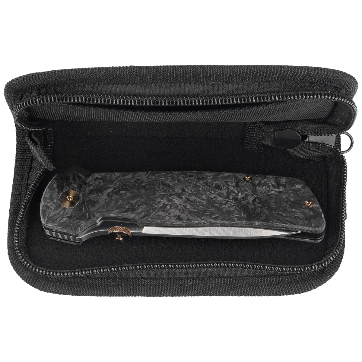 Blade - drop point type finished with elegant satin finish. The pronounced belly extends the length of the cutting edge in relation to the length of the Blade converging towards the needle-sharp tip of the knife, combined with a high, flat grind gives excellent cutting properties. A long false blade on the back increases piercing properties. The blade is set on Teflon washers to support the opening mechanism, allowing the folder to be efficiently unfolded with the thumb disc on the Blade's back. To maintain full control of the blade, upper jimping, a notched thumb rest, was made on the back of the wedge. This solution allows both left- and right-handed people to open the knife without problems. The whole is locked with a proven and popular liner lock.