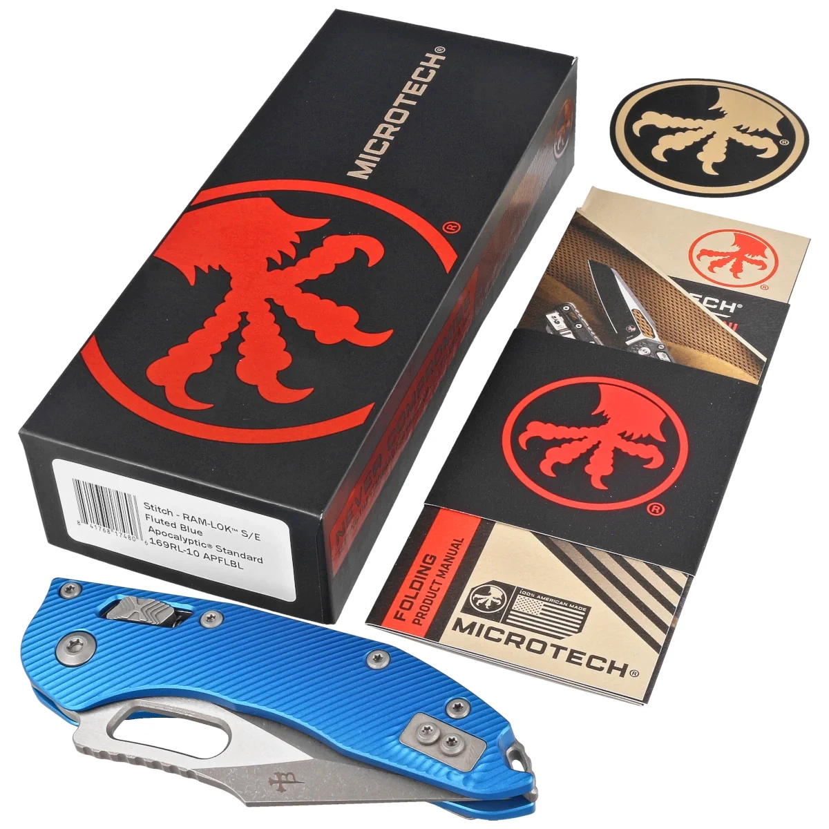 - Stitch Ram-Lok S/E Blue Fluted G10, Apocalyptic manual version of the popular design by Sebastijan Berenjie of Borka Blades and Microtech. Wide harpoon-shaped blade, excellent materials and legendary quality workmanship from Microtech Knives.
