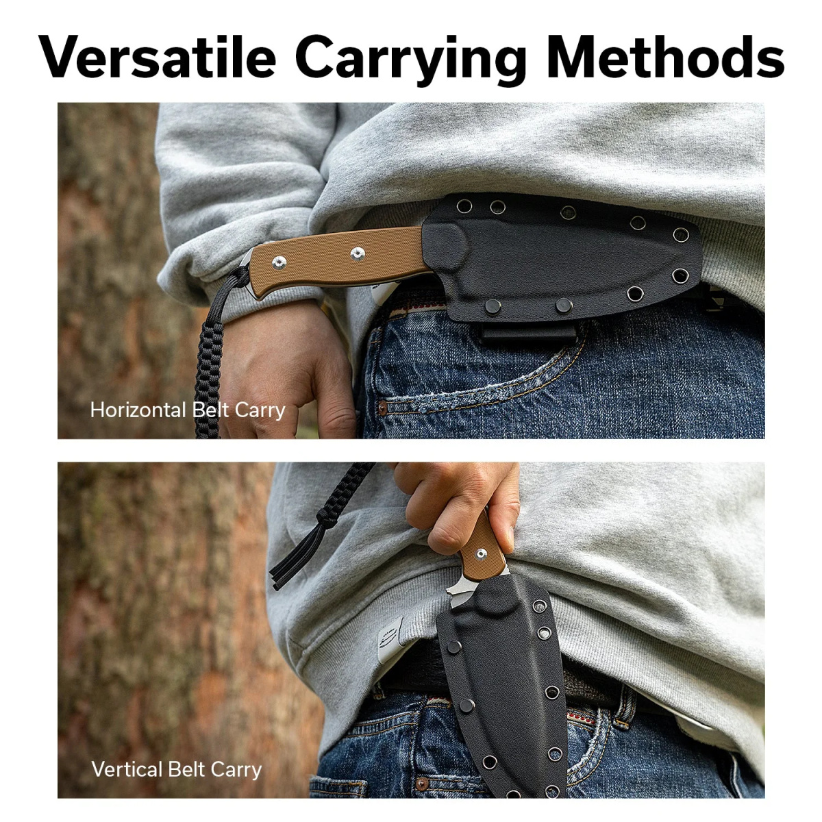 Sheath – crafted from black Kydex, securely holding the knife in place. Equipped with a T-Clip mount designed by Bob Terzuola, it enables multi-positional (right/left, vertical/horizontal) carrying on a belt or gear. The T-Clip, functioning similarly to a Tek-Lok, offers belt attachment for fixed-blade knife, allowing users to customize their carrying preferences. T-Clip reinforced with fiberglass (FRN), includes a set of screws along with a pair of plastic washers.