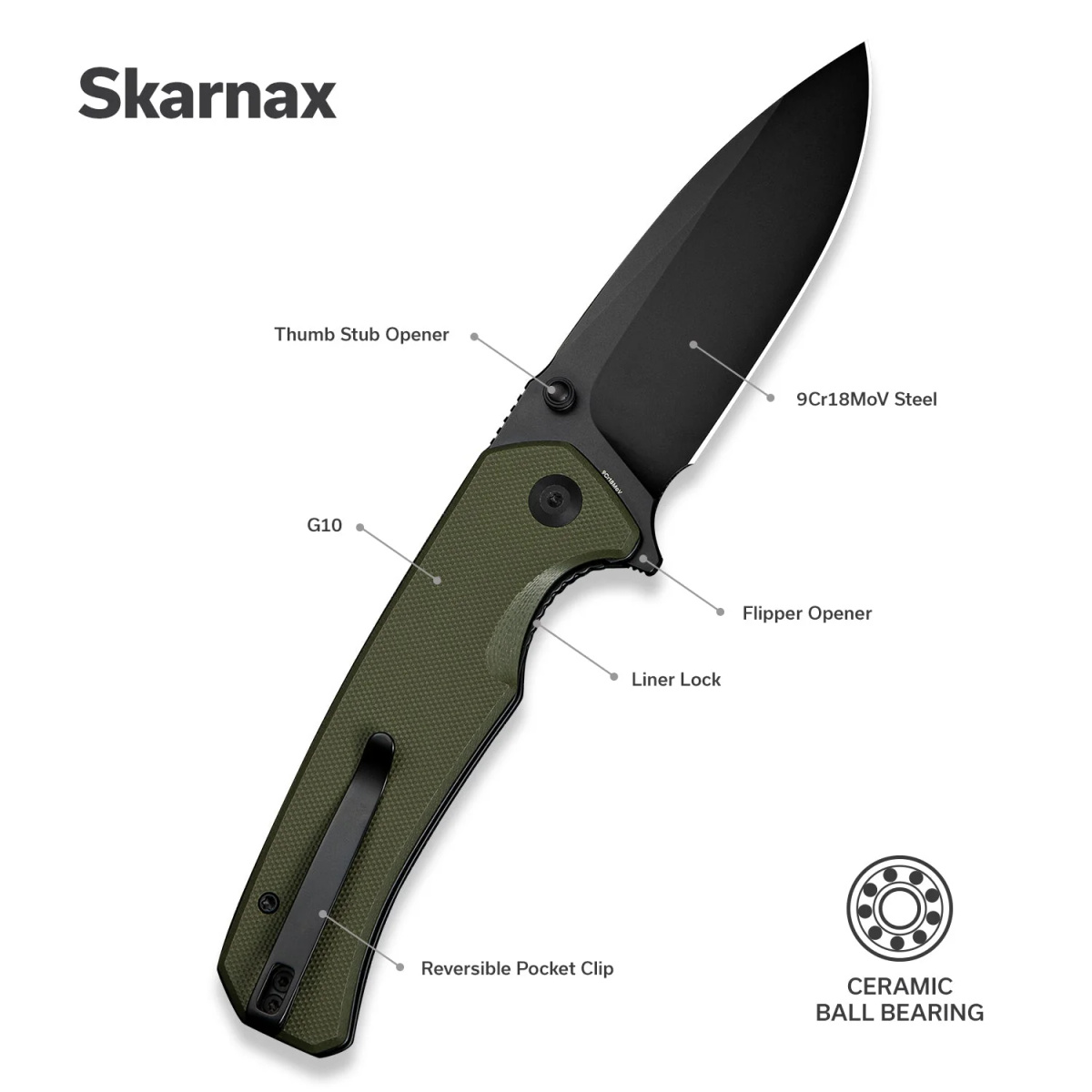 - Skarnax OD Green G10, Black, large EDC folder designed for daily use. Features a full-size G10 composite handle and a blade made of 9Cr18MoV stainless steel. It can be opened in two ways: using the flipper or the dual thumb studs on the blade.