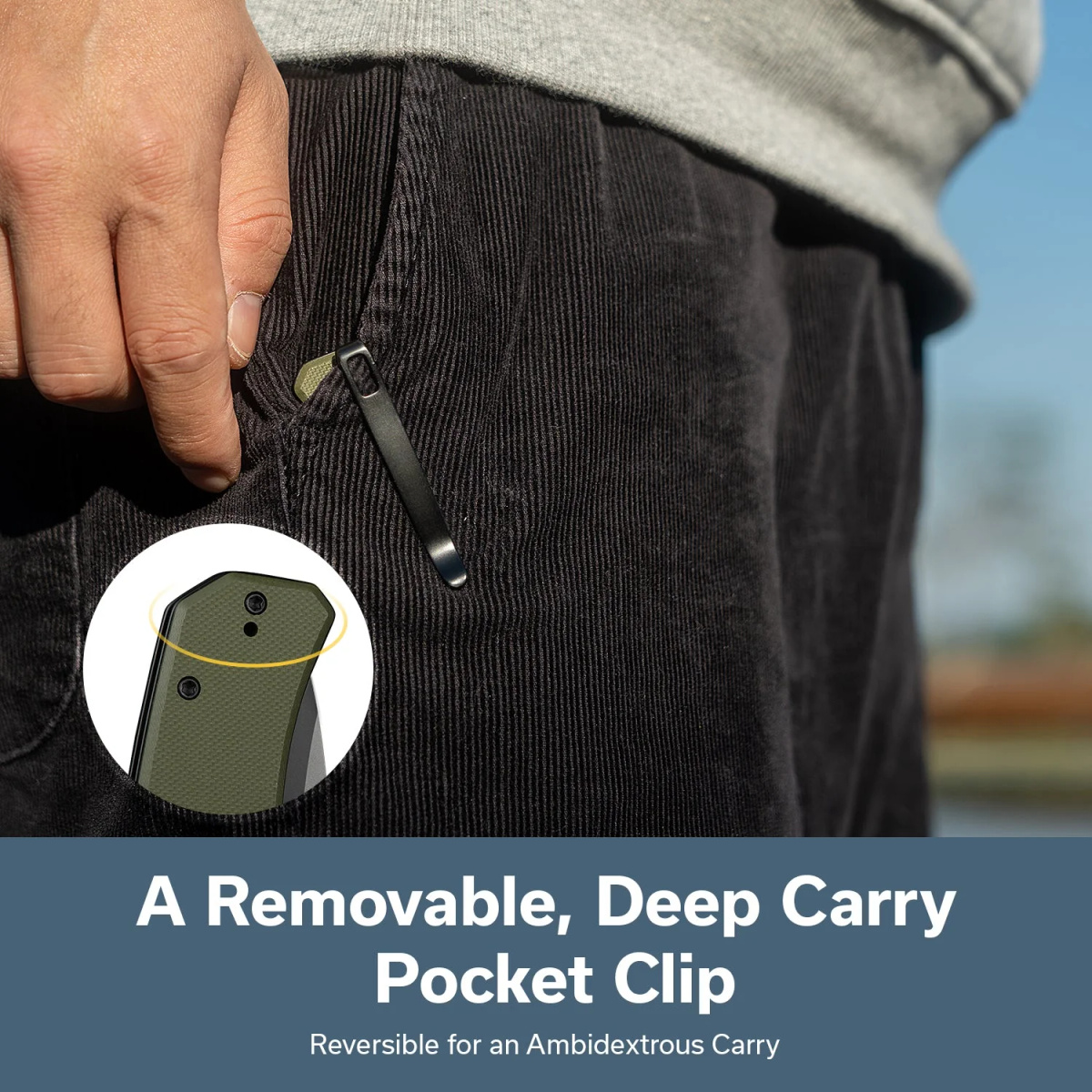 Handle - made of G10 composite, practically indestructible plastic, insensitive to weather conditions, resistant to chemicals and mechanical damage. Chamfered edges of the covers eliminate sharp edges for comfort, grip. Open-backed design fixed with steel spacer sleeves reduces weight and facilitates cleaning. A fore finger groove made on the front improves grip security. Two-position, right/left deep carry clip allows you to carry the knife discreetly in your pocket in tip-up position (blade tip up).