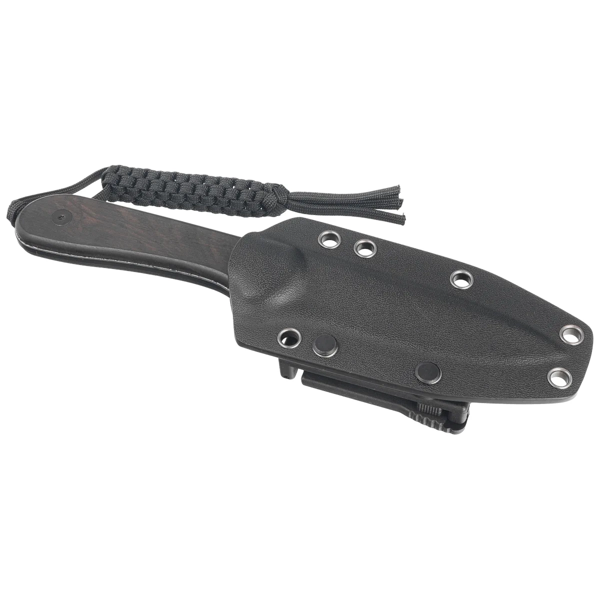 Sheath - has been made of black kydex and with the help of a T-Clip, gives the possibility of multi-position (right/left, vertical/horizontal) attachment to a belt or to the equipment. Using the included cord, we can also hang it around the neck.