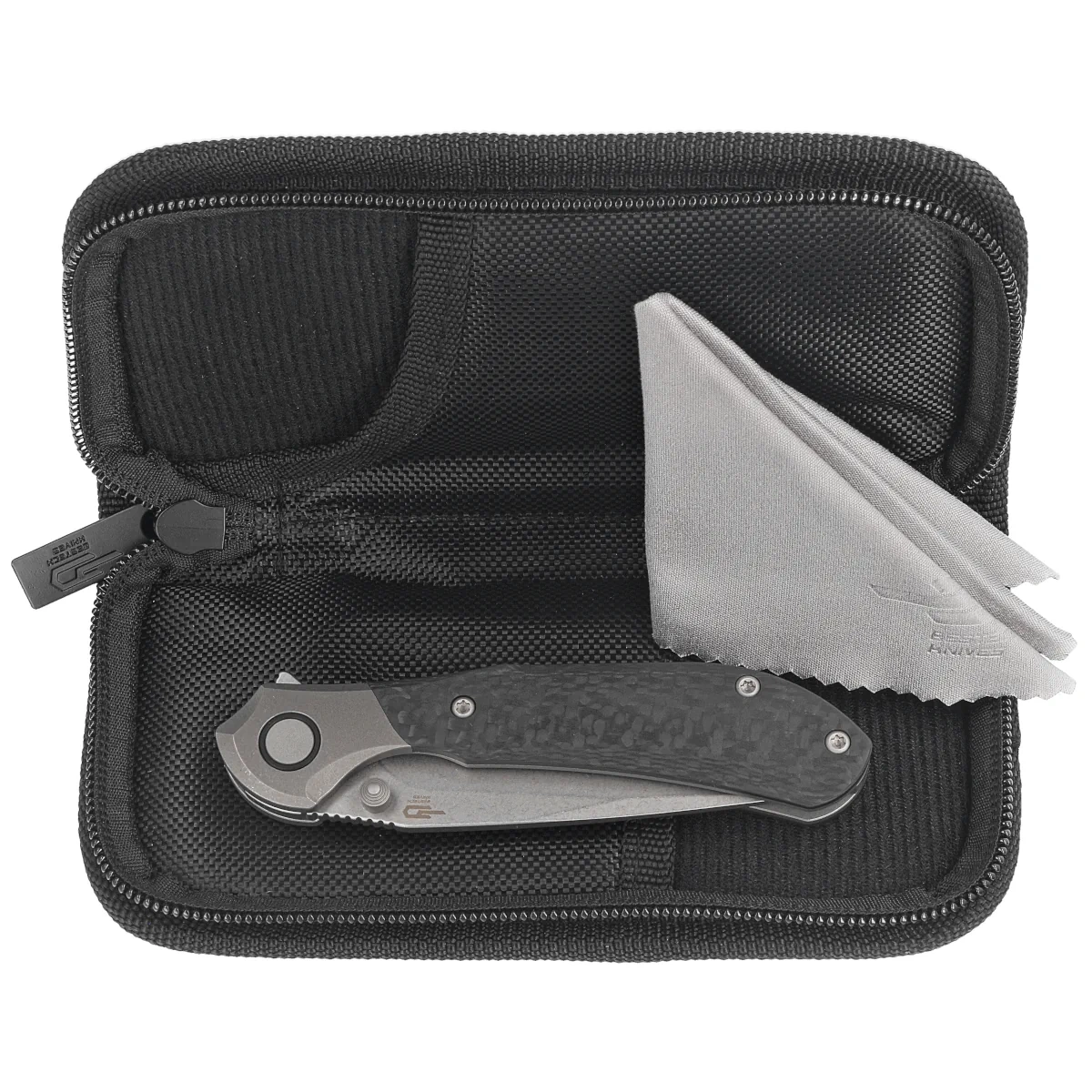Case - the knife is packed in a zippered nylon soft pouch with the brand's logo for safe carrying and storage of the folder.