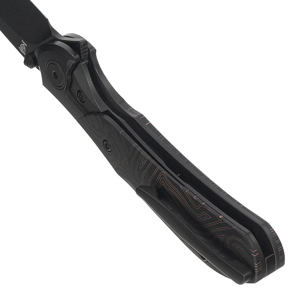Handle - made of solid 6AL4V titanium coated with black PVD coating with a perfectly integrated Thin Line Pattern G10 composite inlay. The chamfered edges of the covers eliminate sharp edges for comfort, and the fore finger groove improves grip security. The titanium backspacer to which the grips are attached guarantees the rigidity and strength of the entire construction. A single-position, right-handed titanium clip allows the knife to be carried in tip-up position, with the tip of the blade upward.