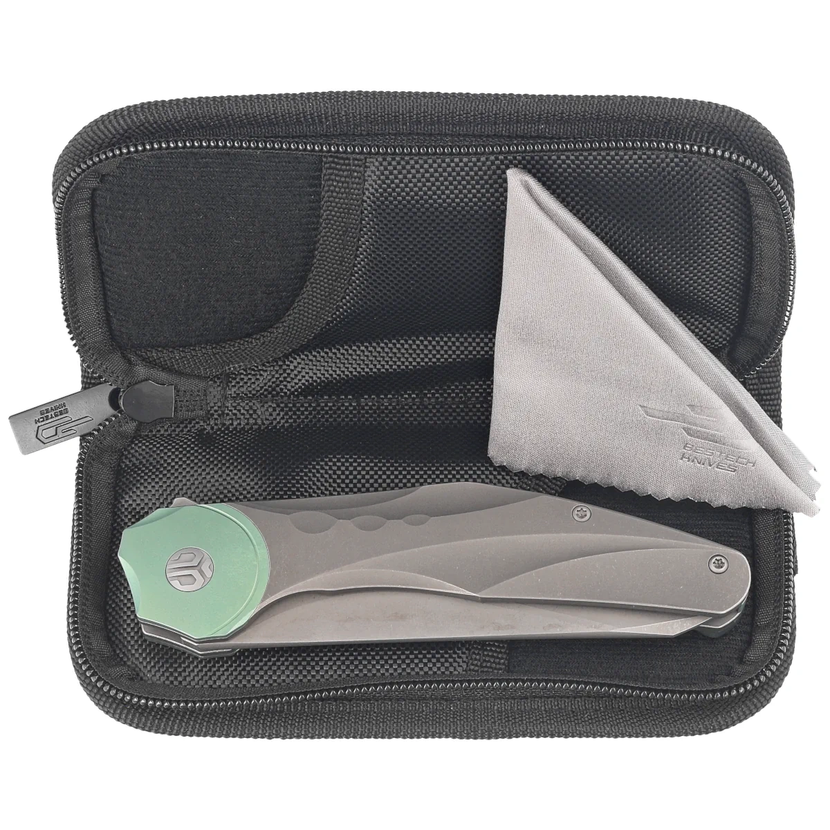 Handle - made of milled titanium 6AL4V, beveled edges of the covers eliminate sharp edges. The whole bolted to a solid backspacer, also made of titanium. The pivot axis is decorated with a bolster made of titanium in a contrasting color. A fore finger groove improves grip security. A single-position (right) titanium deep-carry clip allows you to carry the knife discreetly in your pocket in tip-up (blade tip up) position.