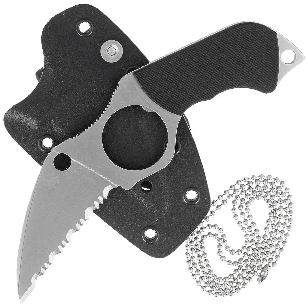 • Swick 5 Large Black G10, Satin Spyderedge neck knife design by Sal Glesser, founder of Spyderco. LC200N stainless steel blade. Ergonomic handle with 26.1 mm finger hole and G10 composite liners. Sheath is made of Boltaron thermoplastic. An excellent tool!