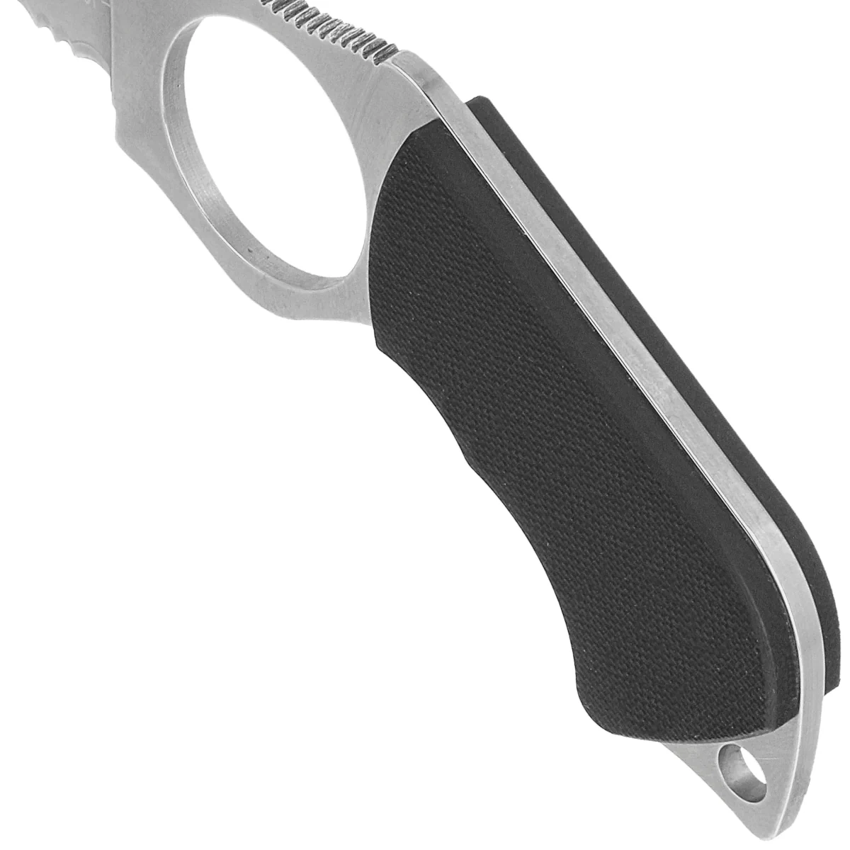 Handle - tang of the knife with grips, made of G10 composite, practically indestructible plastic, insensitive to weather conditions, resistant to chemicals and mechanical damage. In the front part you will find an opening for the index finger, this type of grip prevents the hand from slipping on the blade. Simple, solid construction guarantees many years of use. In the rear part of the Handle, a protruding section of the tang forms a glass striker, it also contains a lanyard hole, a hole for a safety or decorative cord.