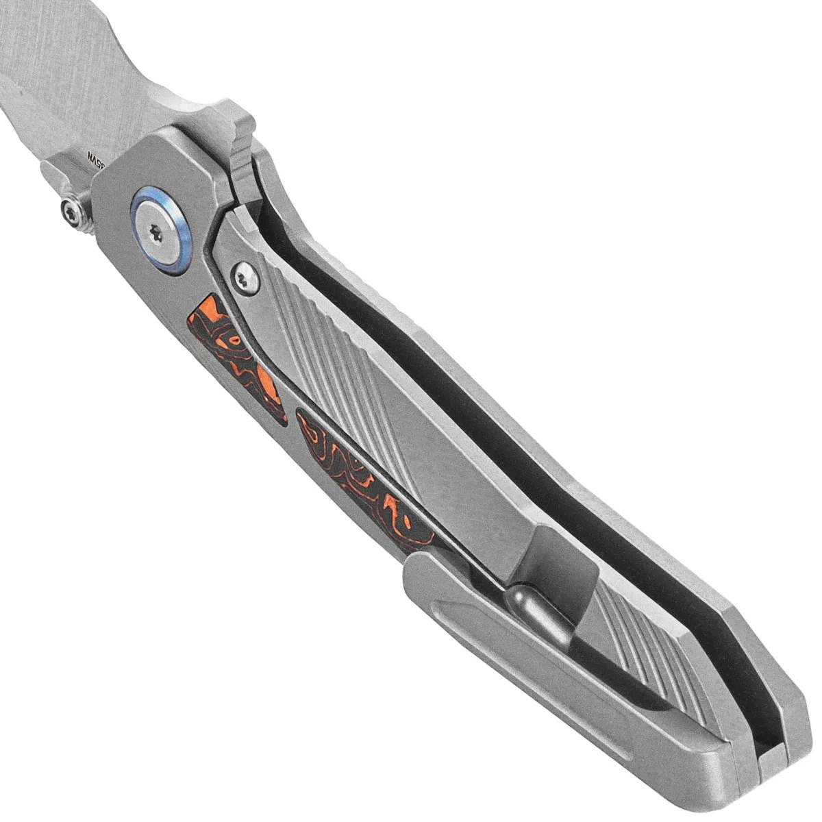 Handle - is thick pieces of titanium 6AL4V, contouring of the covers eliminates sharp edges. On both sides there is an inlay (insert) made of Copper Foil Carbon Fiber composite. Only a few companies are able to make the Handle with such incredible accuracy! The grips are joined together using a titanium backspacer. A right-handed, single-position titanium deep-carry clip allows you to carry the knife discreetly in your pocket in tip-up (blade up) position. The pivot axis is decorated with a titanium rim (pivot collar cap).